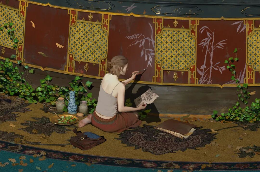 他用一幅幅作品构建完整复杂的“世界观”,在创作时还会搭配简短的介绍设定,引导观者融入画中世界。