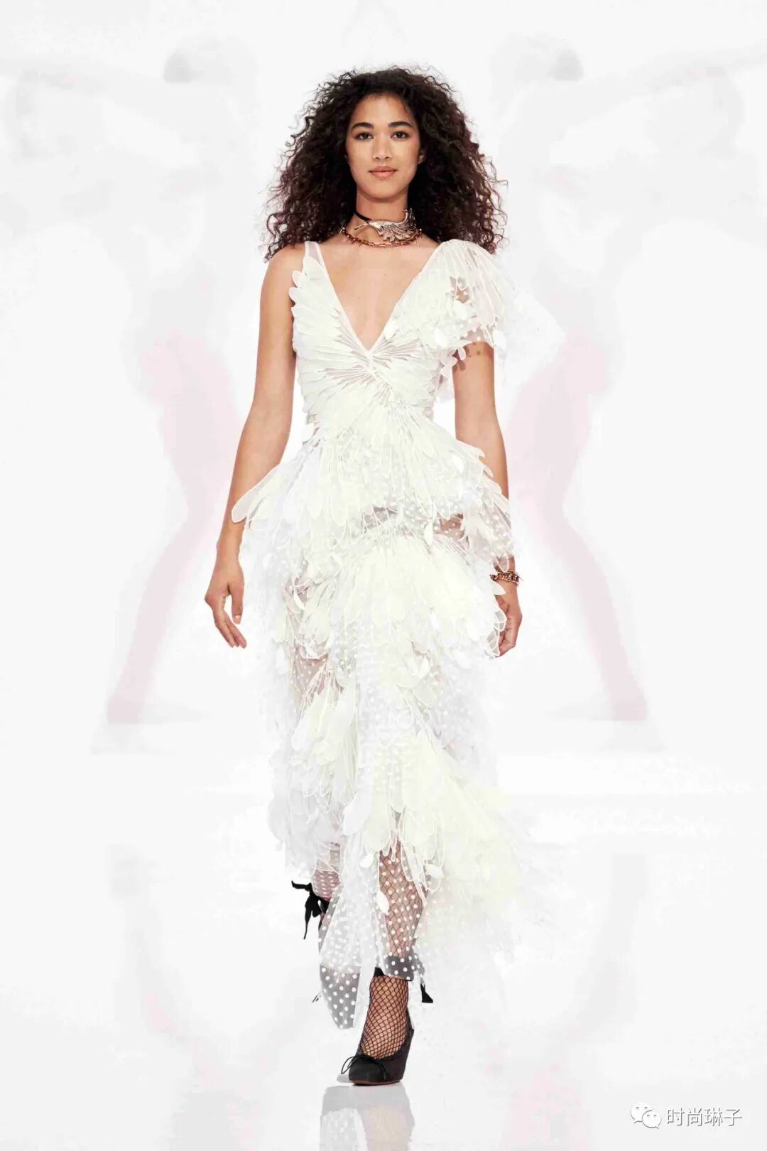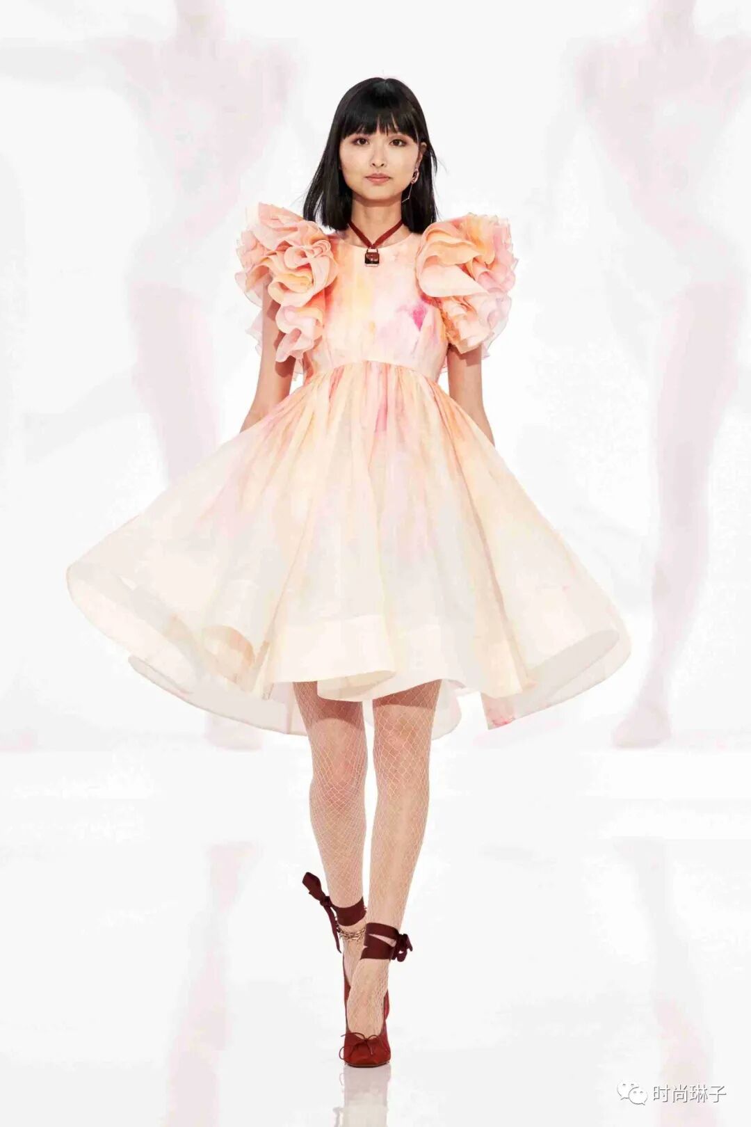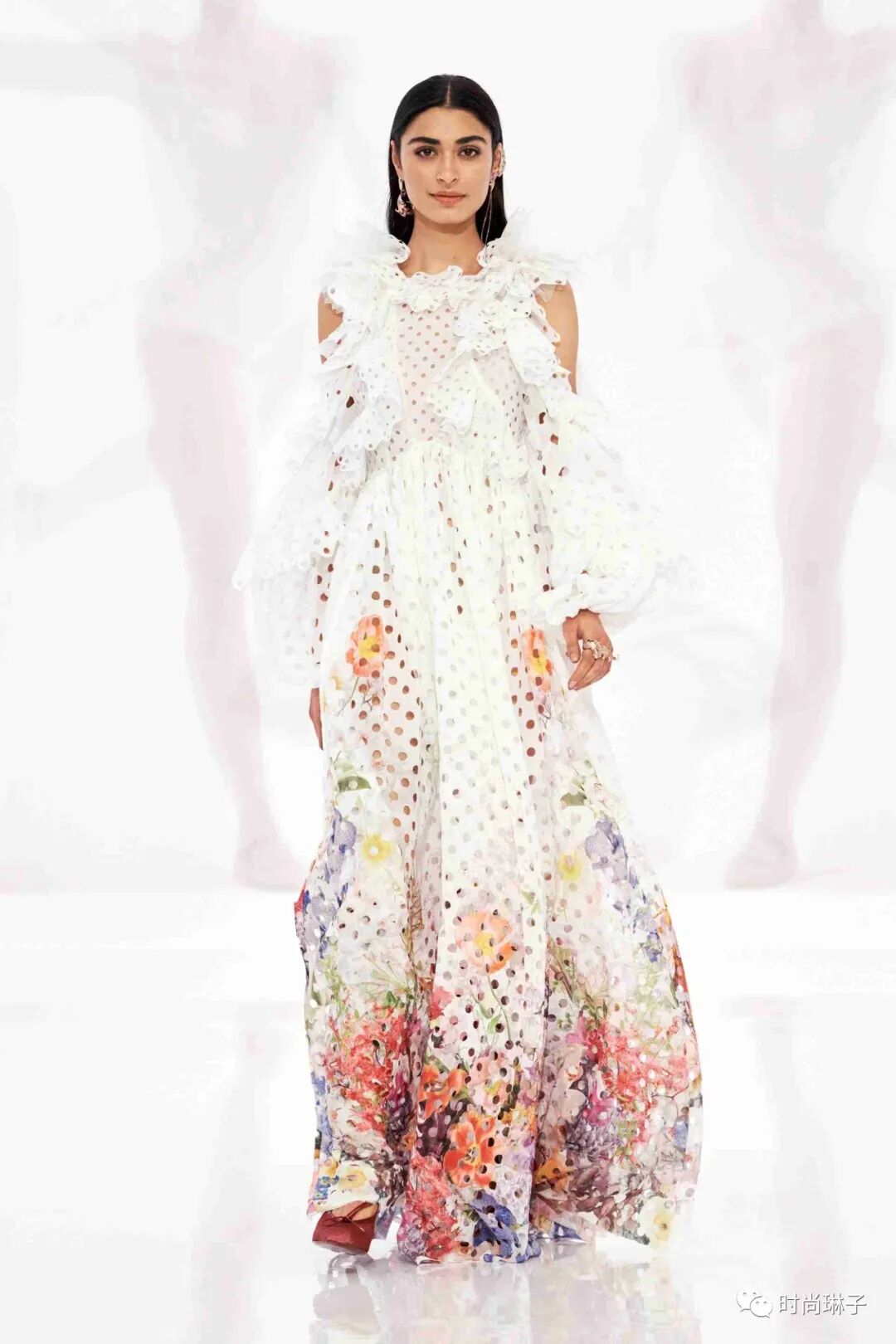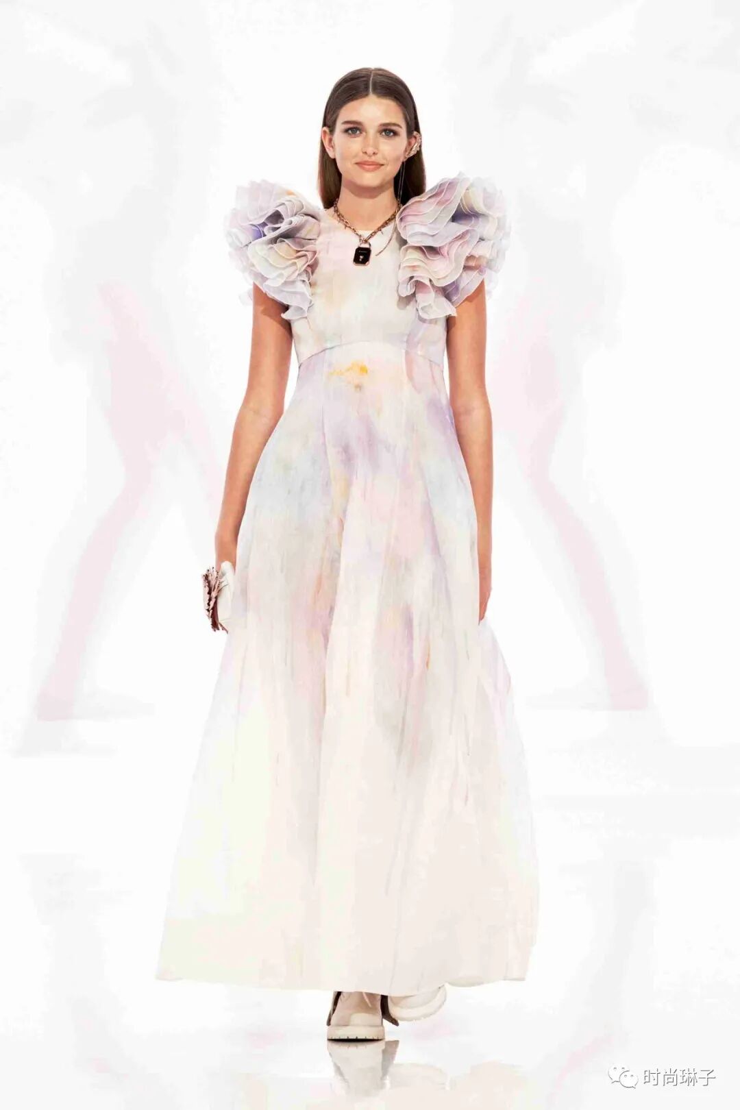 激光切的花瓣装饰着收腰的裙装廓形,十分浪漫。女性化的多层褶皱花边在双肩以及斜裁裙摆上营造一种平衡感。