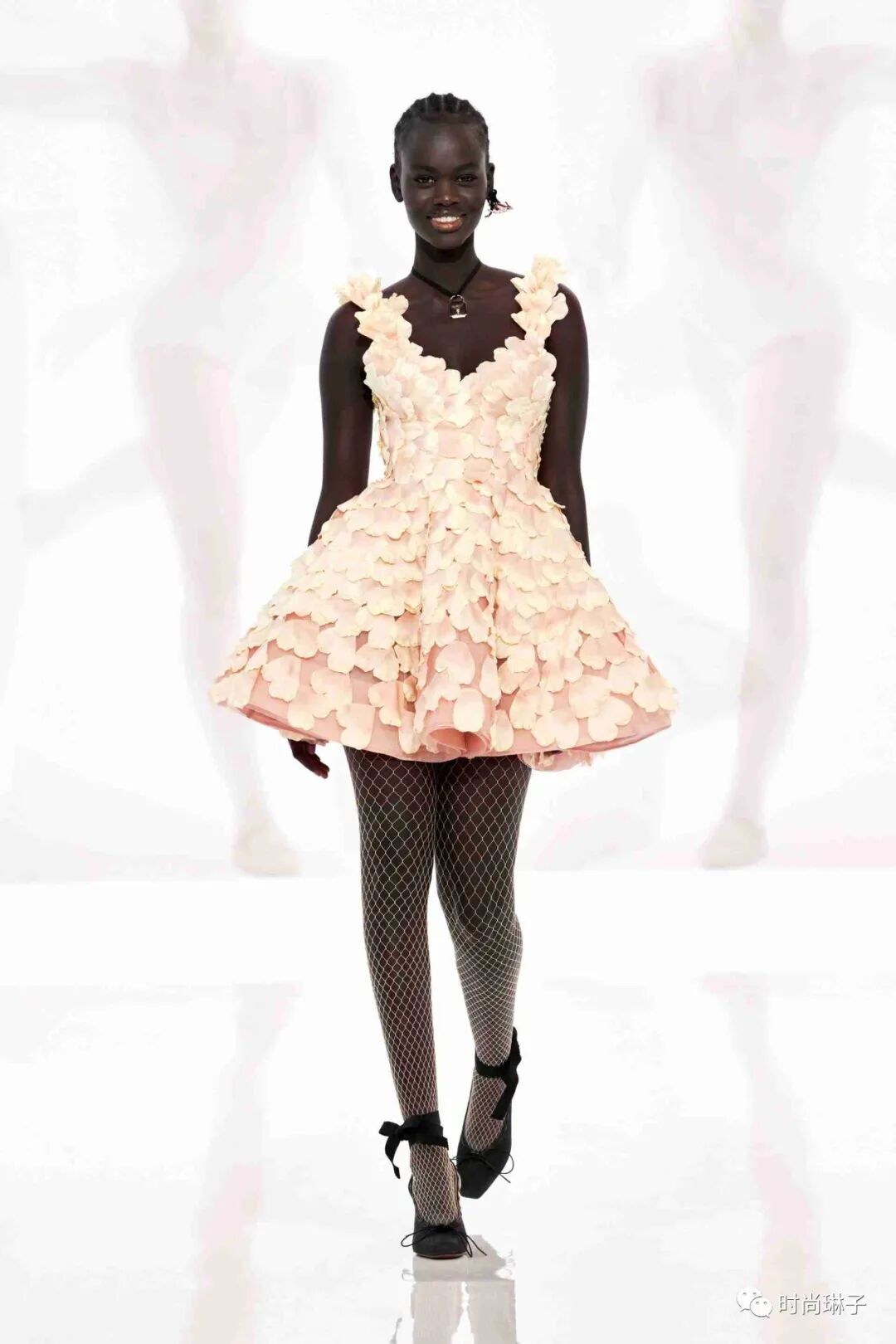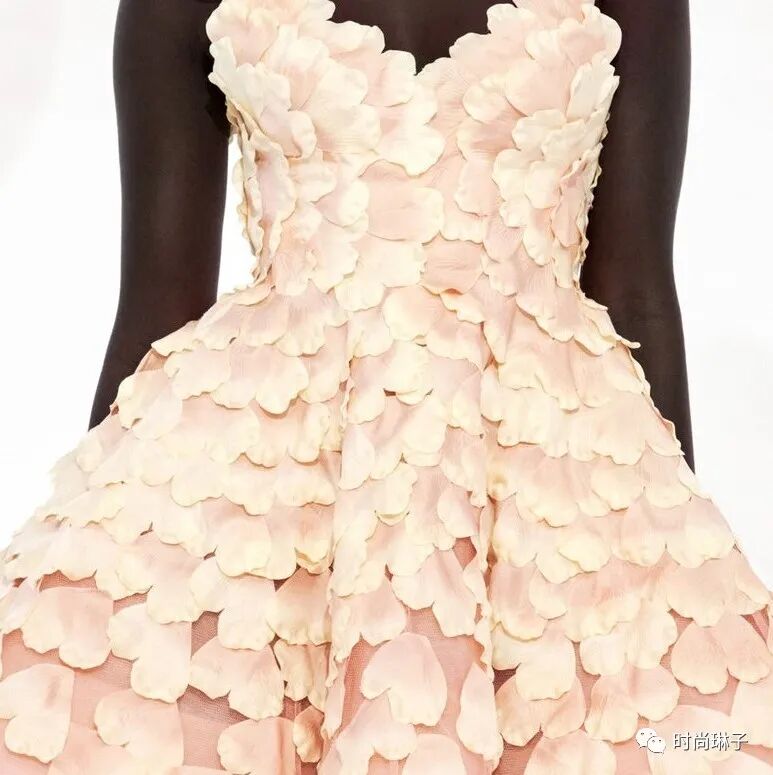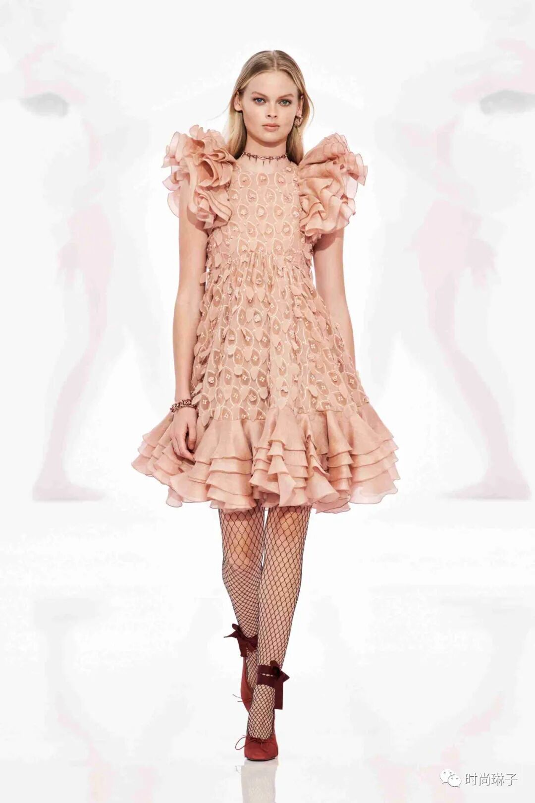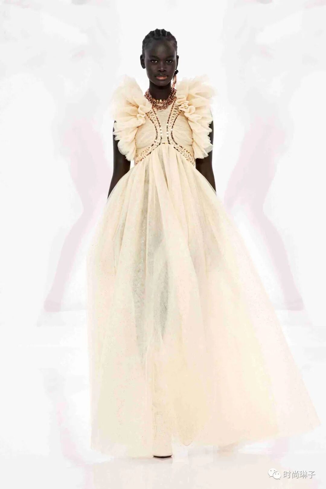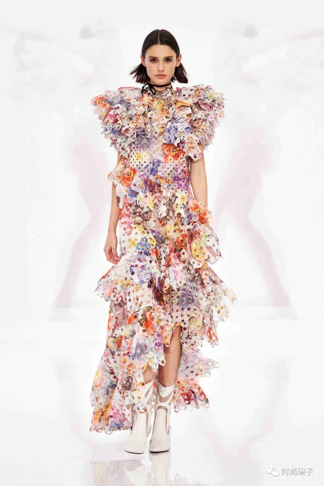 激光切的花瓣装饰着收腰的裙装廓形,十分浪漫。女性化的多层褶皱花边在双肩以及斜裁裙摆上营造一种平衡感。