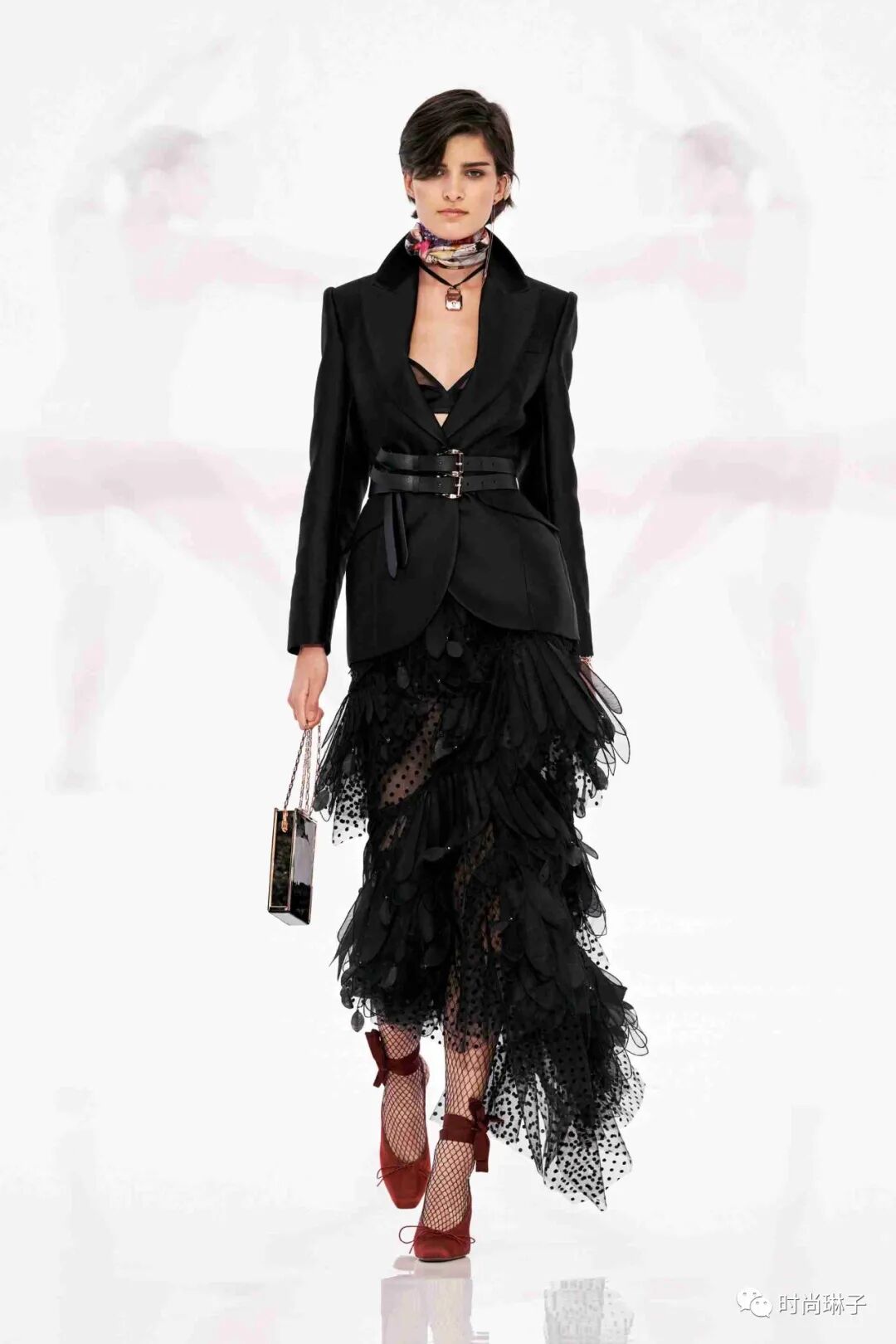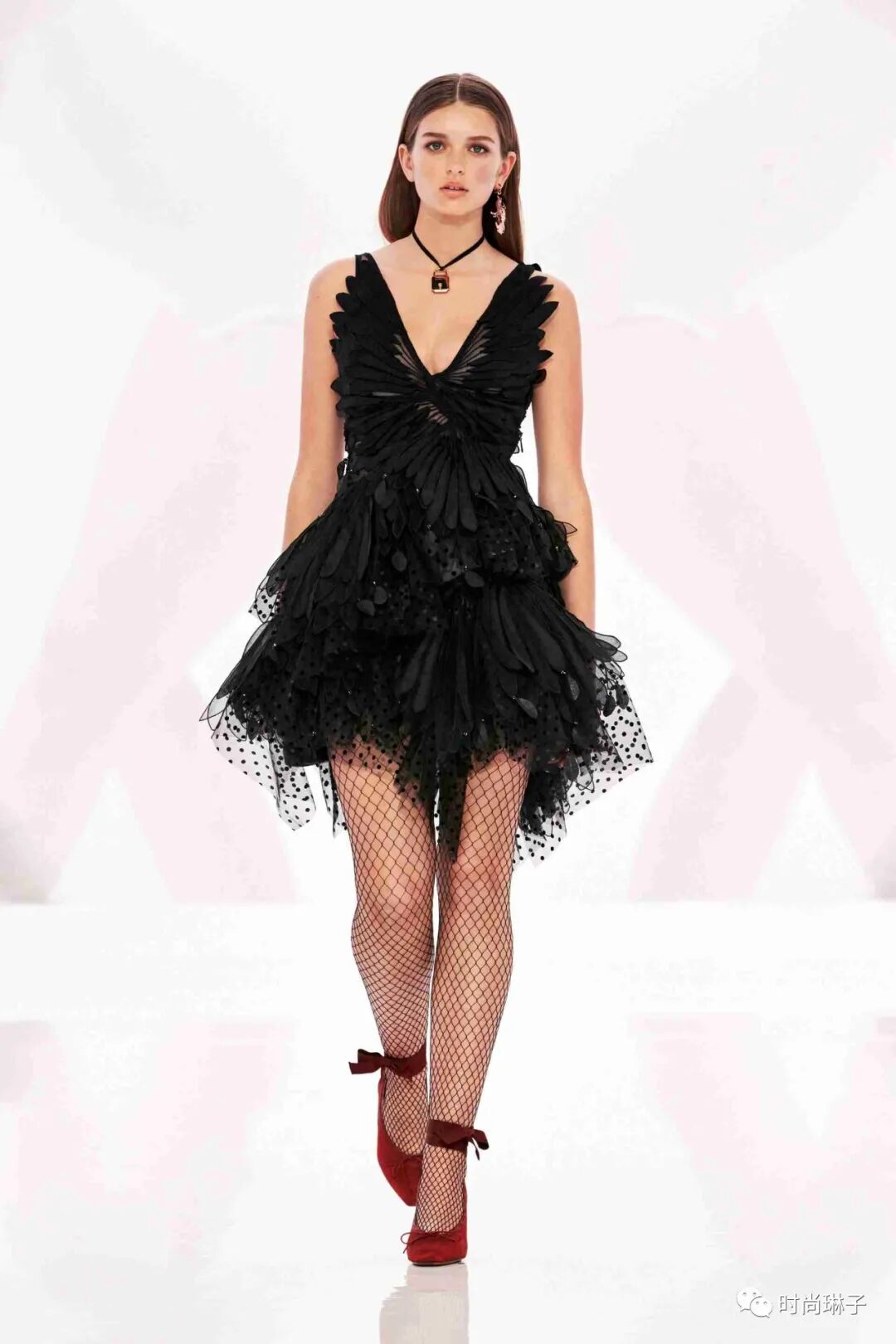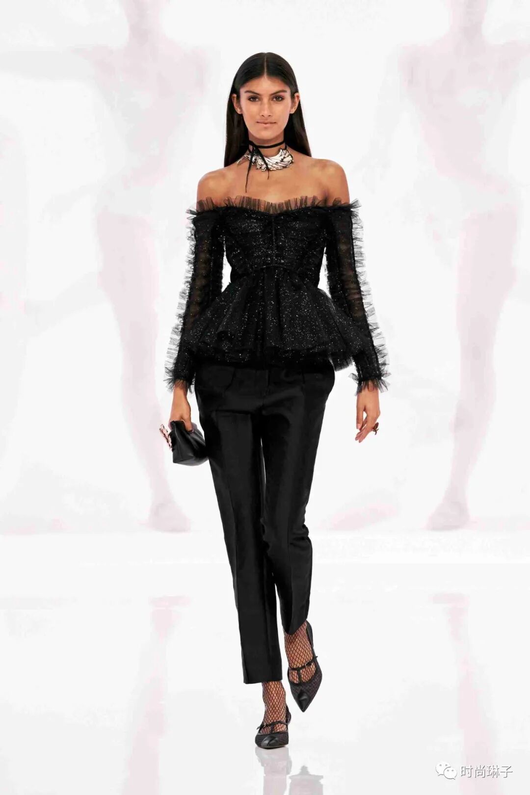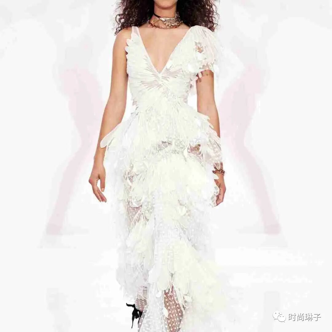 激光切的花瓣装饰着收腰的裙装廓形,十分浪漫。女性化的多层褶皱花边在双肩以及斜裁裙摆上营造一种平衡感。