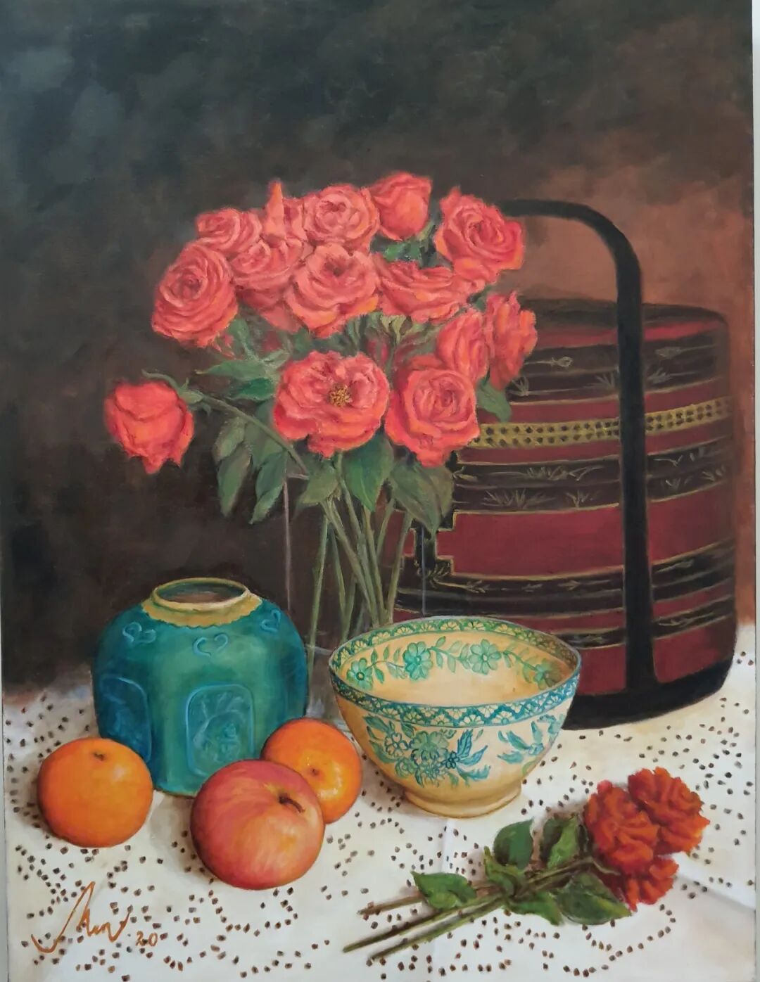 《玫瑰和古董碗》 布面油画 80x60cm 2020
