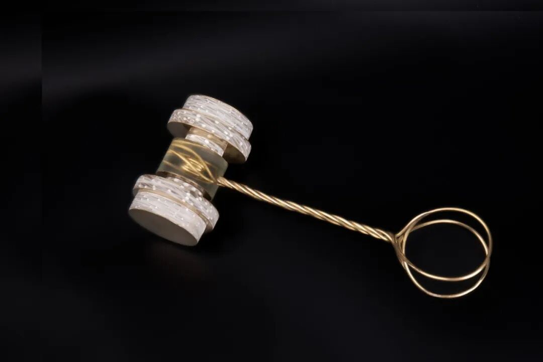 《法槌之实质的正义》 装置 铜、羽毛、树脂 10x6.5x27cm 2021年