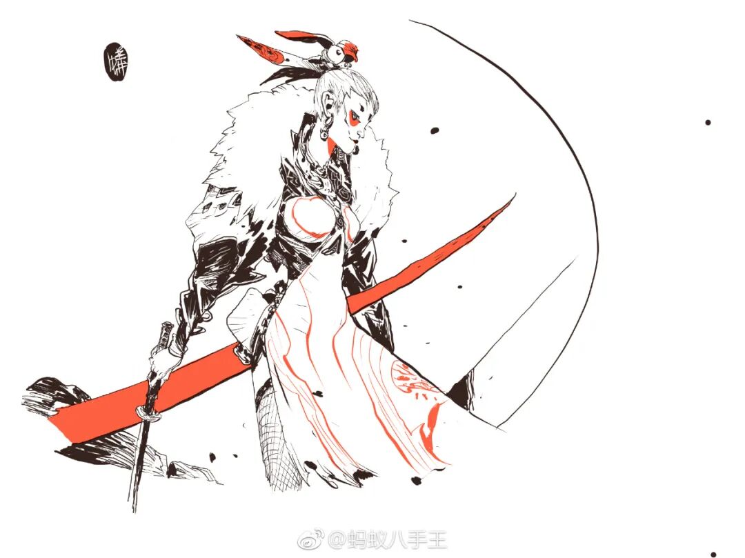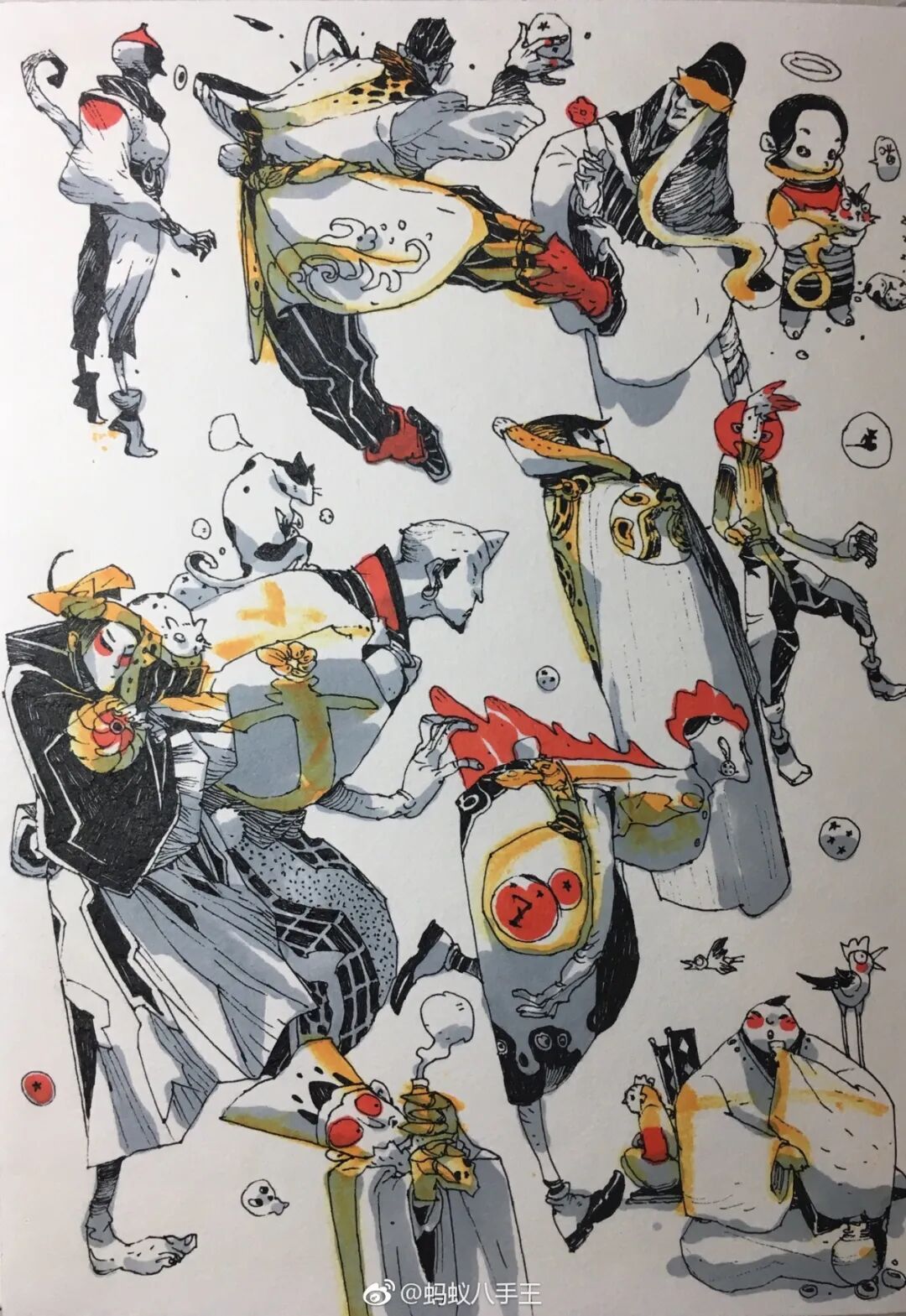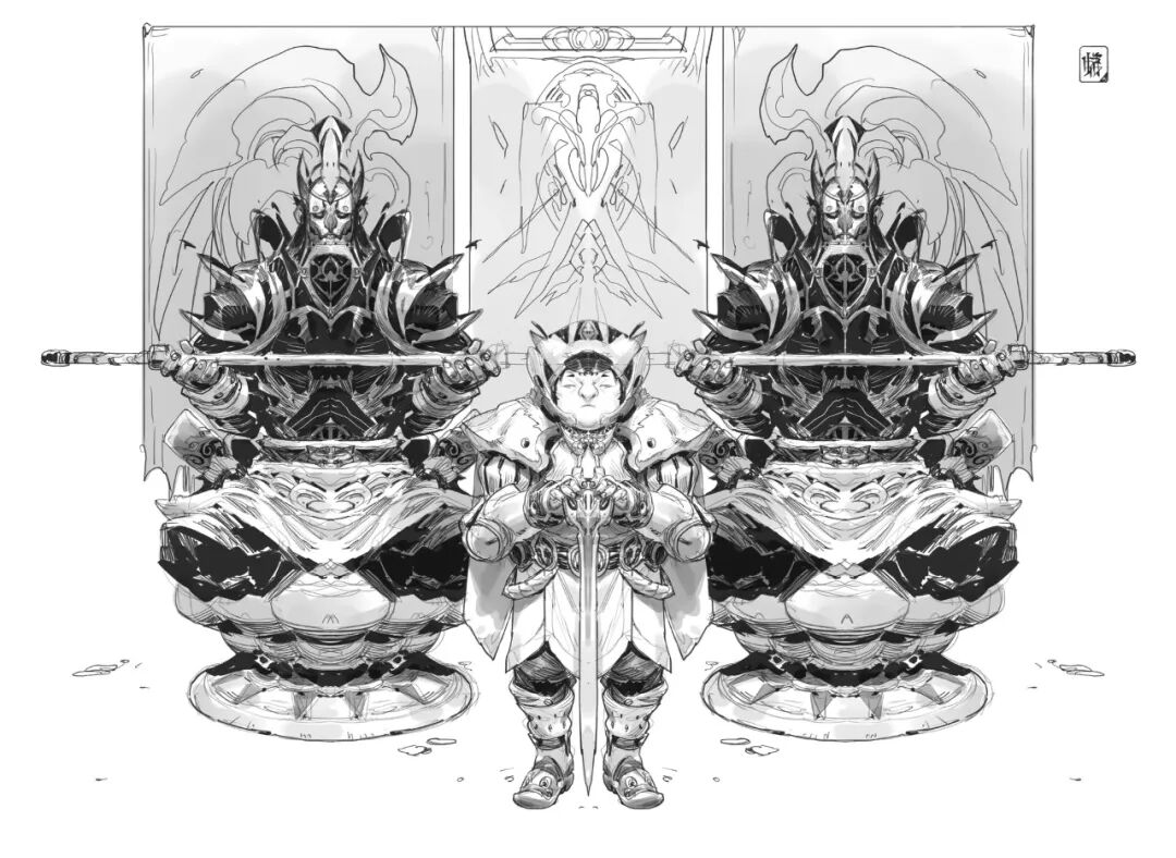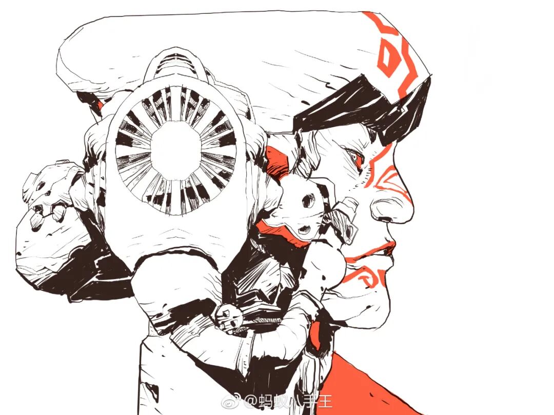 蚂蚁八手王:其实,只能算是找到了一个“妥协”的方式。以前学习上色喜欢着重去表现强烈体积与光影感,结果在一些较为复杂的设计向线稿临摹上,这些效果都不尽人意,因为强烈光影与体积在控制不好的情况下,很容易破环原有线稿中的设计感,很多线稿中的设计点根本无法展示出来,所以我选择了较薄的伪厚涂方式来处理上色,这样便可以去保持原有线稿当中的一些“简繁”“轮廓”“主次”了。这个平衡依然是有轻重的平衡感,我的图依然还是以黑白+线为主,上色会放在相对轻的地方。