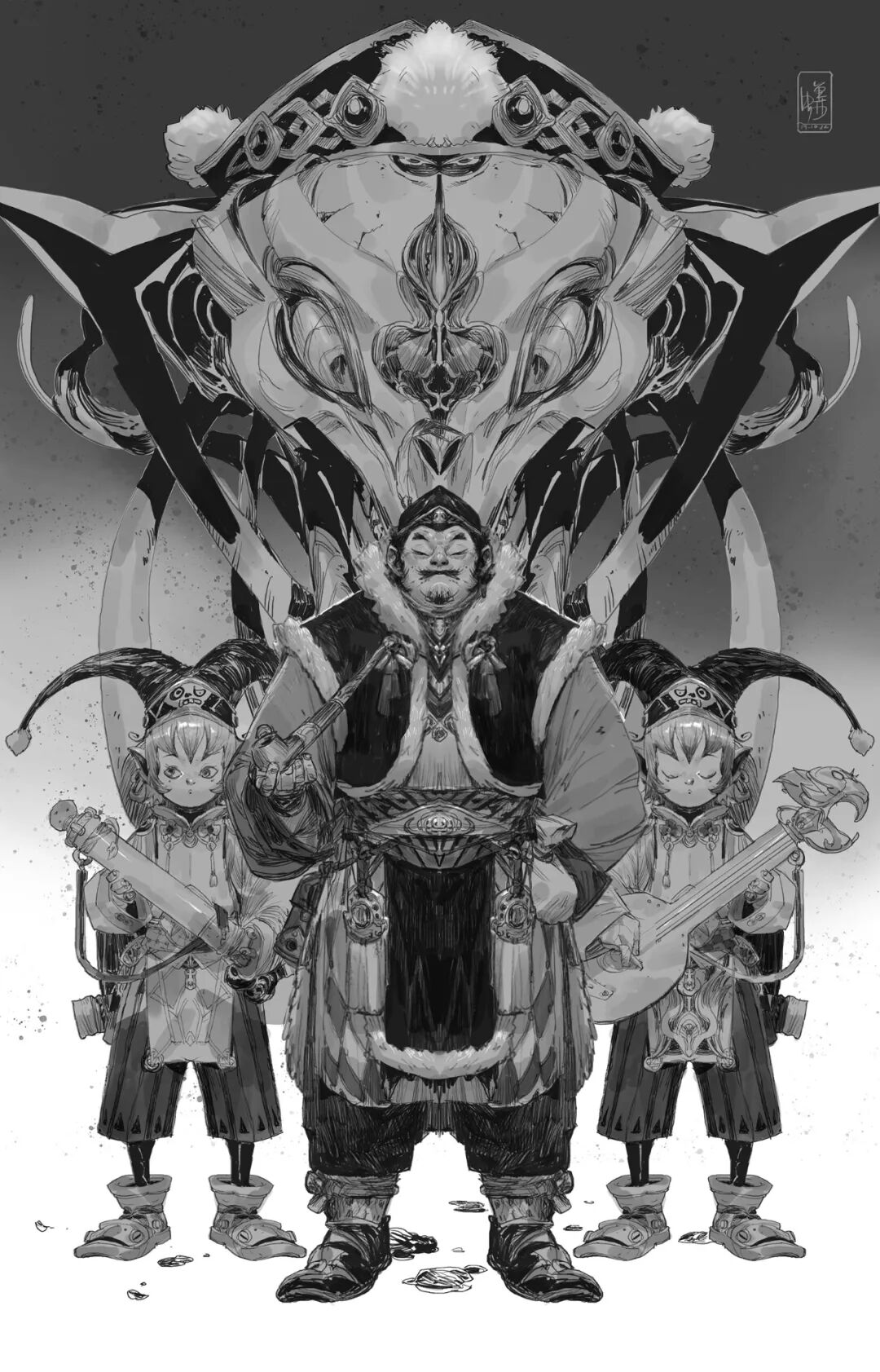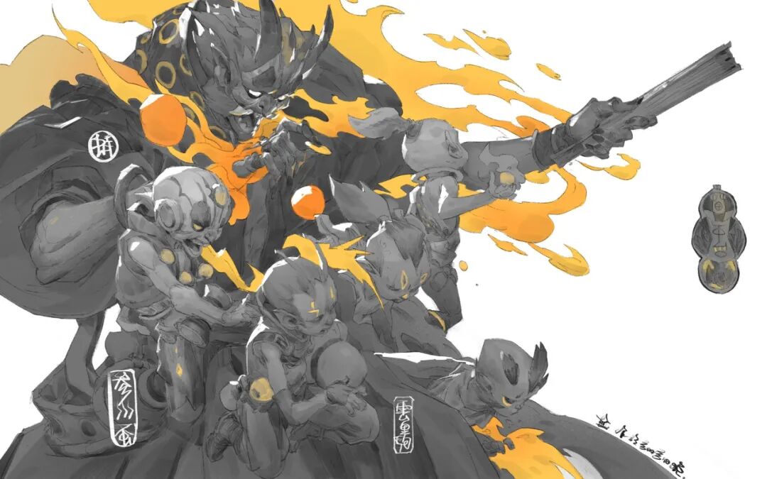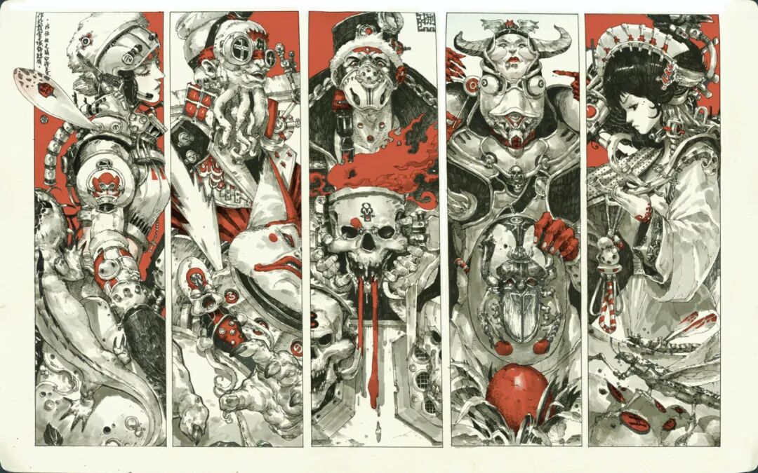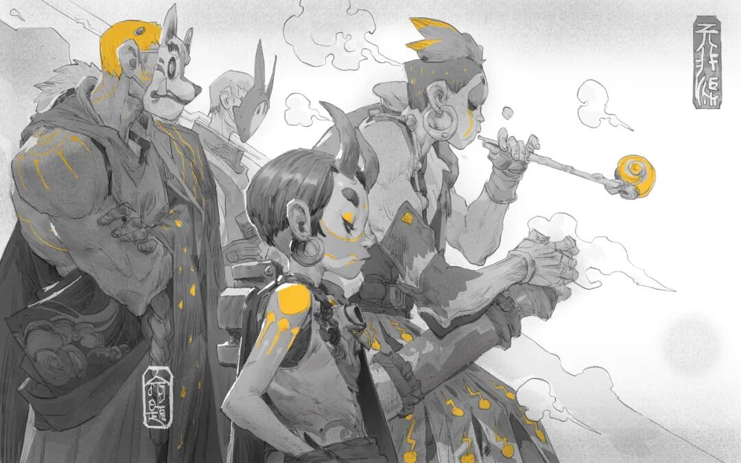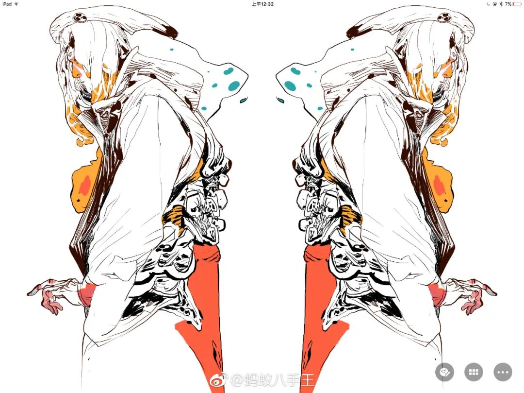 蚂蚁八手王:其实,只能算是找到了一个“妥协”的方式。以前学习上色喜欢着重去表现强烈体积与光影感,结果在一些较为复杂的设计向线稿临摹上,这些效果都不尽人意,因为强烈光影与体积在控制不好的情况下,很容易破环原有线稿中的设计感,很多线稿中的设计点根本无法展示出来,所以我选择了较薄的伪厚涂方式来处理上色,这样便可以去保持原有线稿当中的一些“简繁”“轮廓”“主次”了。这个平衡依然是有轻重的平衡感,我的图依然还是以黑白+线为主,上色会放在相对轻的地方。