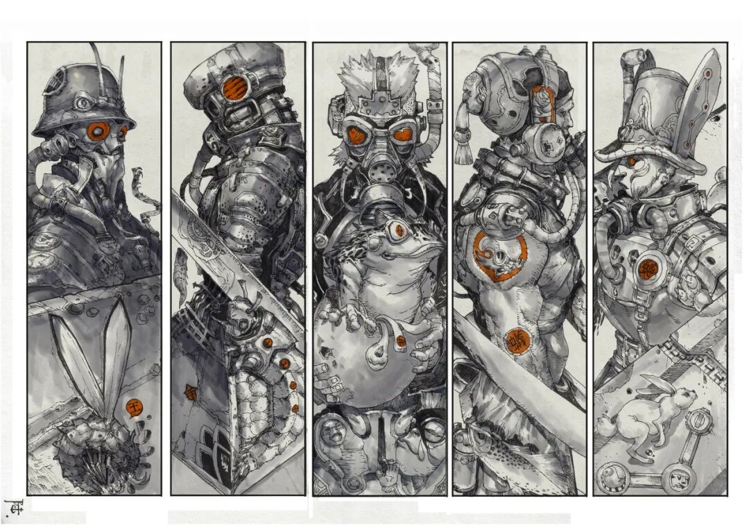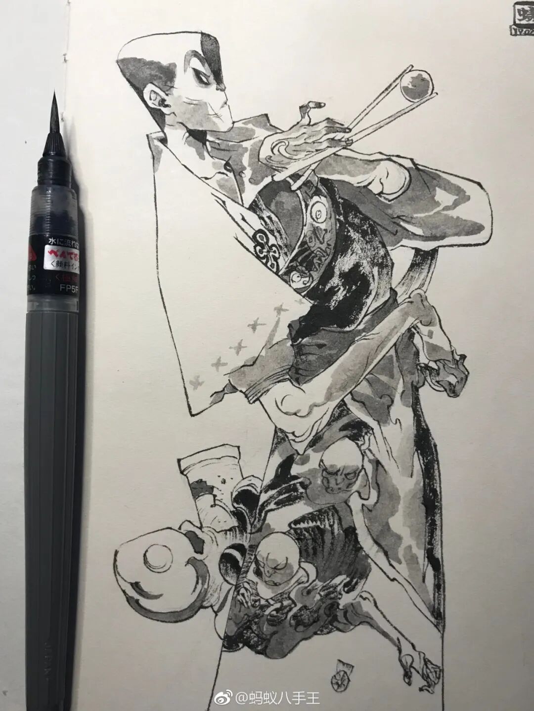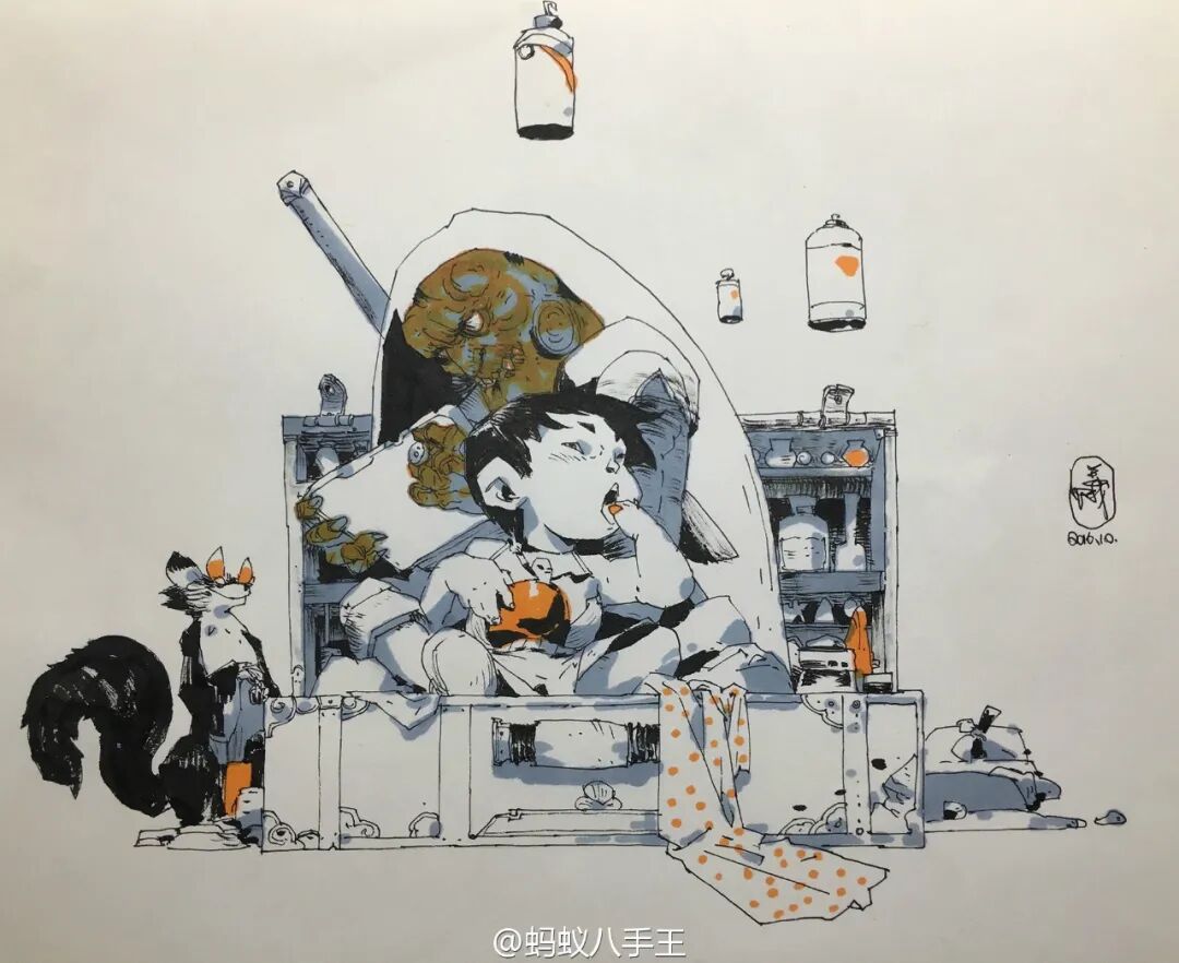 蚂蚁八手王:仔细算算,的确有些年头了。若要回想起对我影响特别大的艺术家其实还挺多的。除去儿时的涂鸦时期,真正拥有学习方向,得从看到《龙珠》漫画开始,在初中和高中的七八年,我临摹最多的就是鸟山明先生的黑白稿,直至读大学后,又开始从其他艺术家作品中学习对线条和题材上新的处理方式,比如寺田克也(野性-粗犷)、以及更鼻祖的莫比斯(克制-肃穆),熟悉这几位大师的都知道(他们的作品多以黑白效果来呈现,我们可以在其中选择最能触碰自己“感受”的线条或效果去学习,钻研,从模仿慢慢过度到在新创作中活用)。