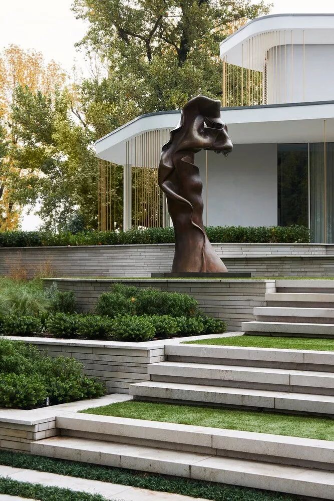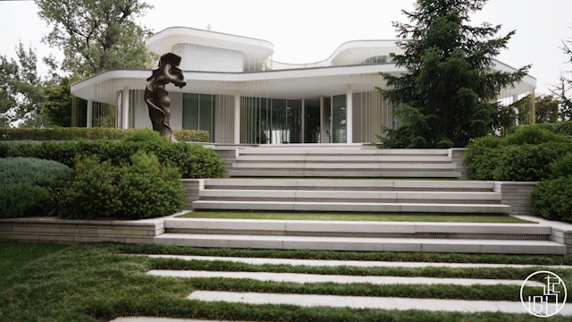 房屋周围的景观绿化由 Colin okasimo Associates 设计,草坪、绿树、树丛围绕着房屋拾级而上,有着非常舒适的绿色环境。