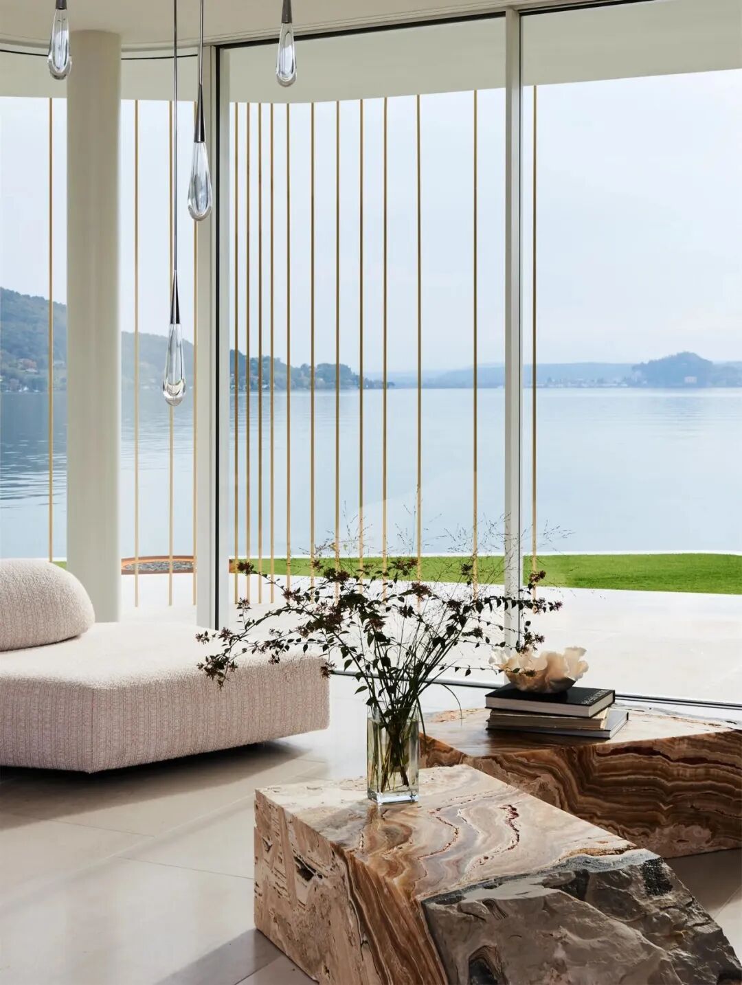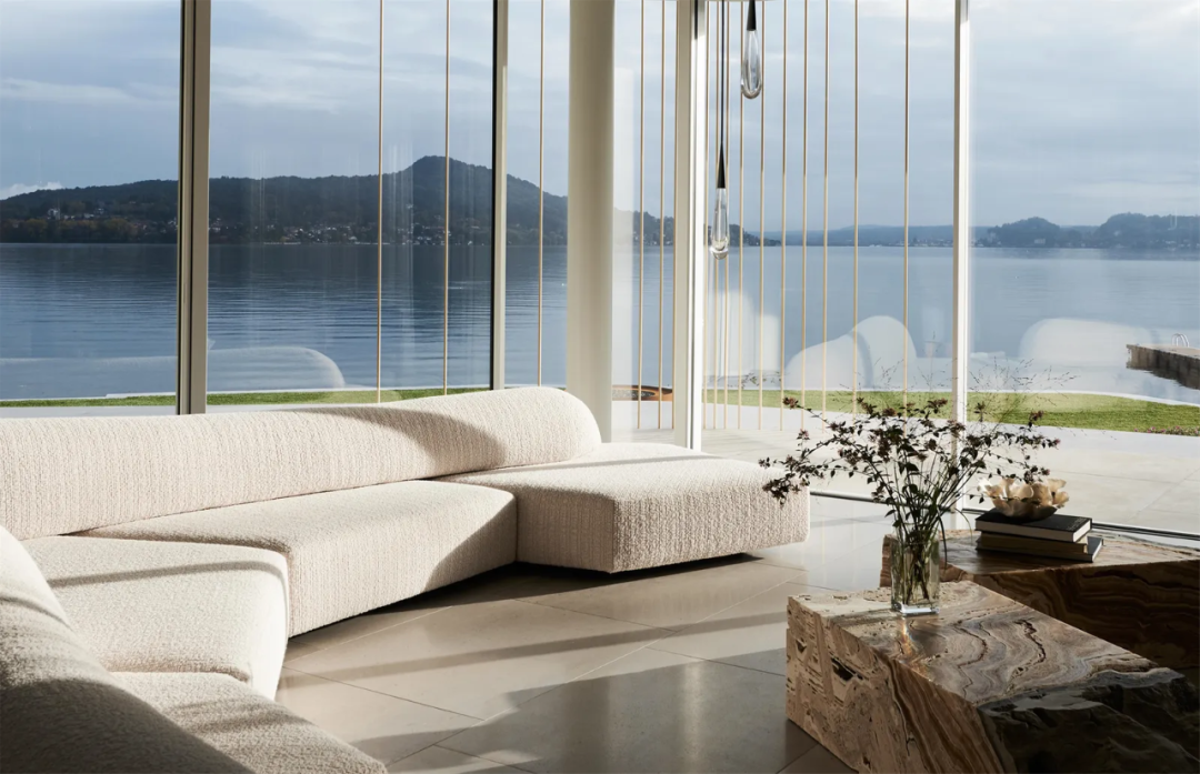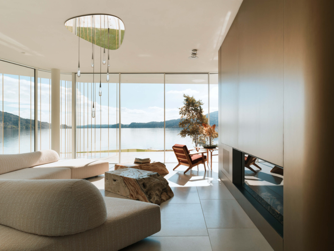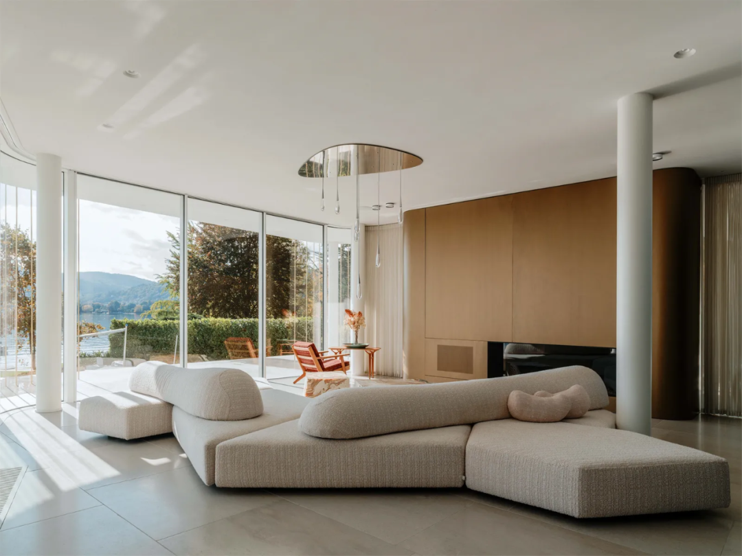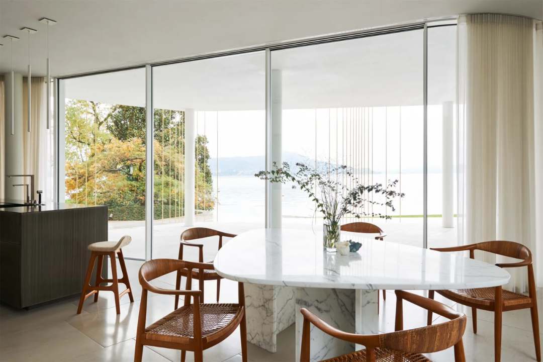 客厅处还通过大片的透明玻璃保证了屋内的采光,也能在室内观赏到花园里和湖畔四季的变化。