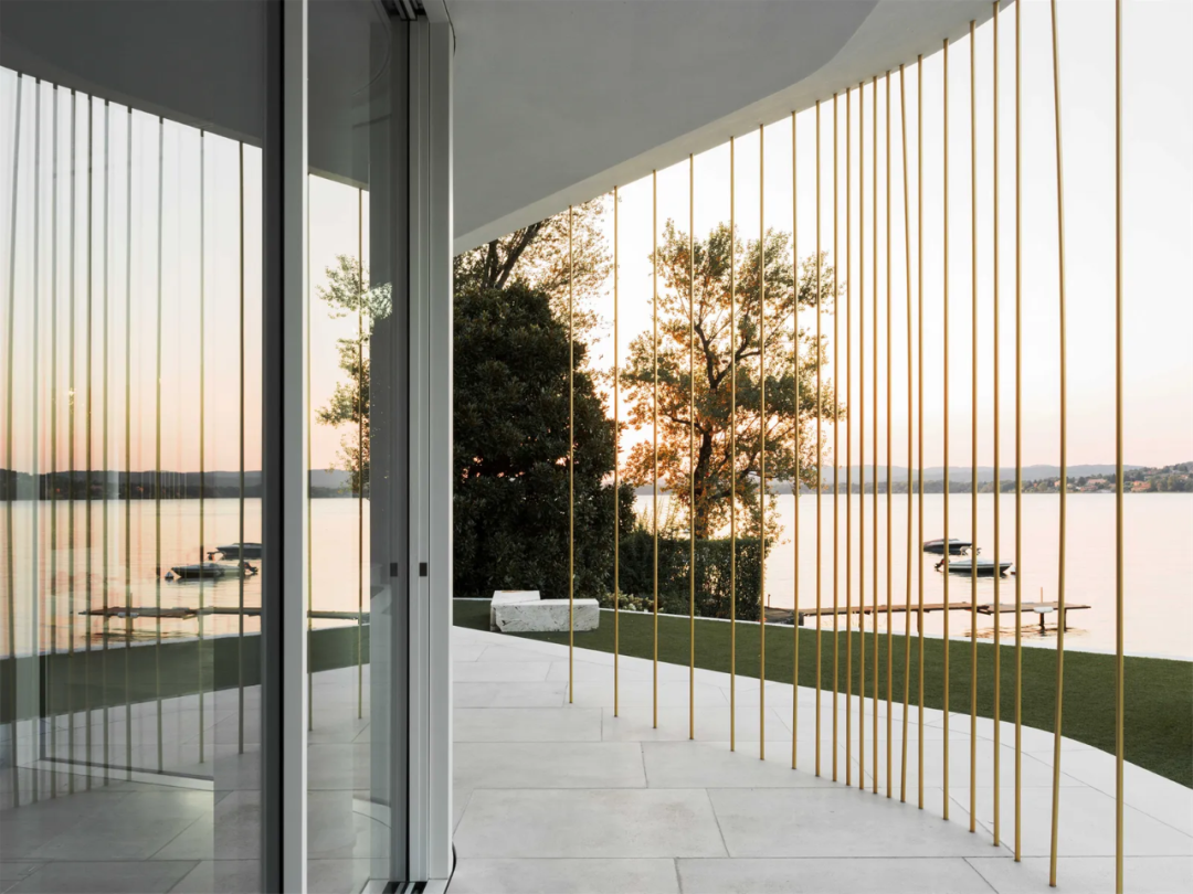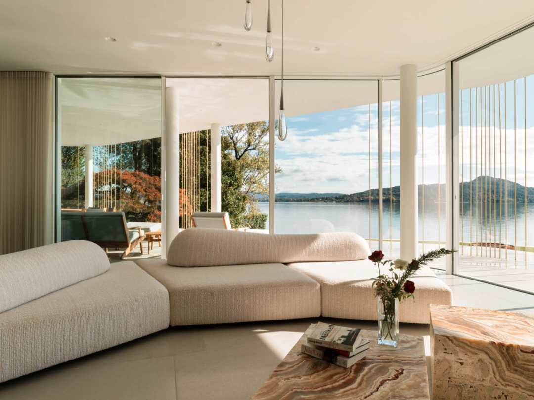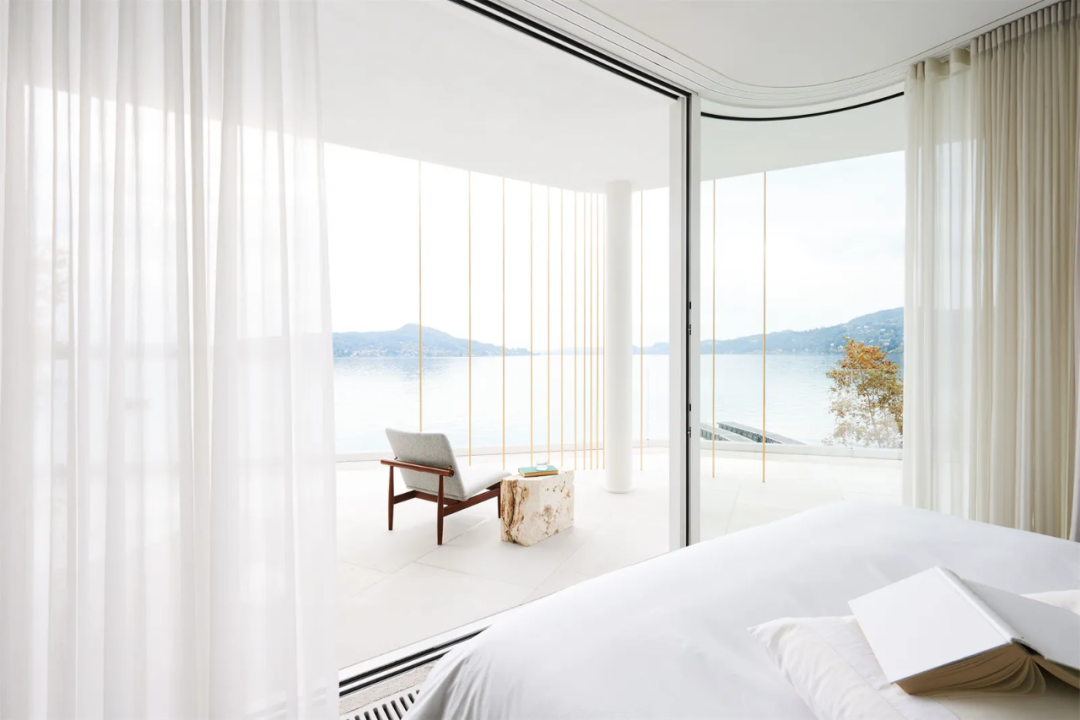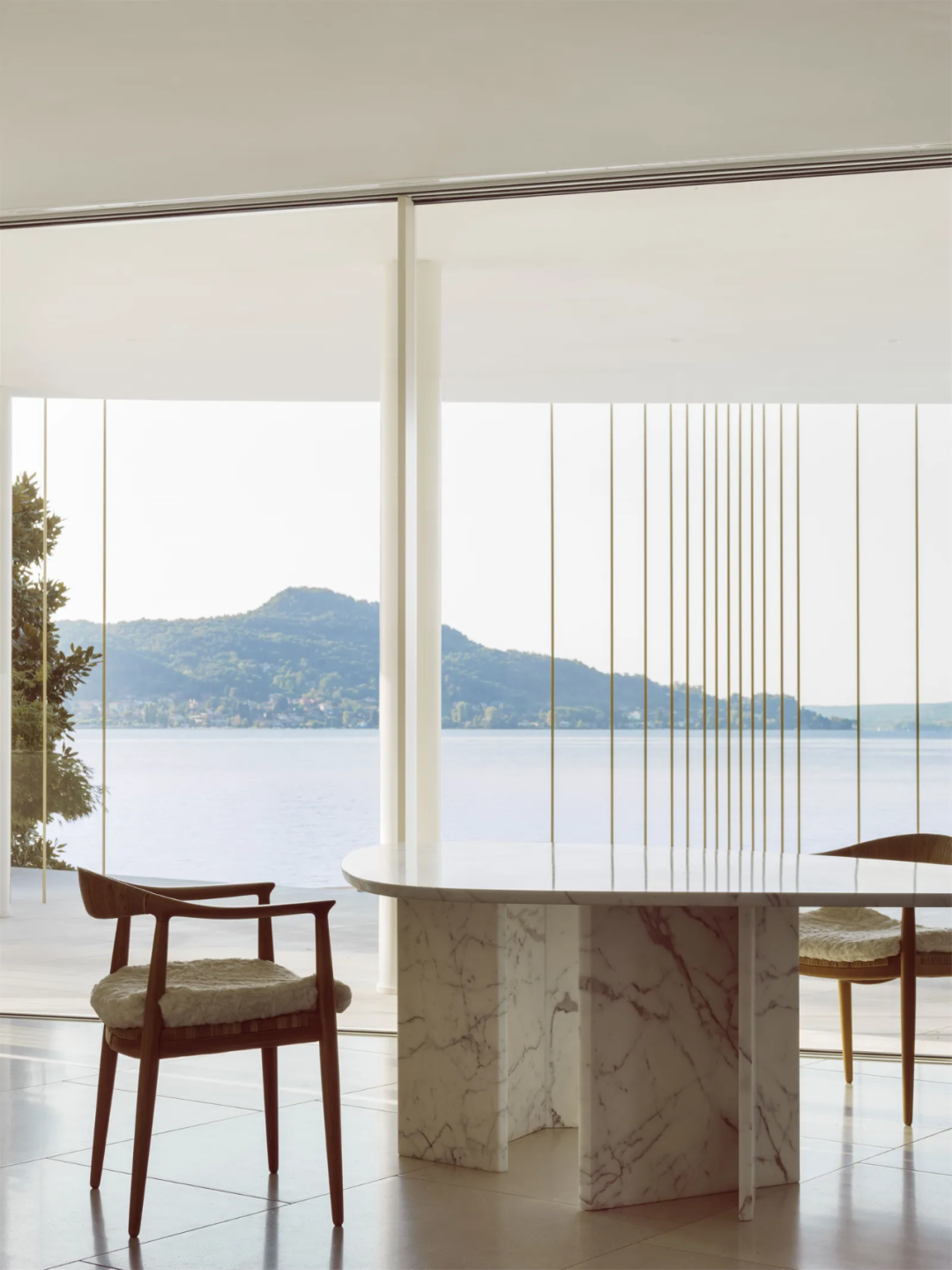 客厅处还通过大片的透明玻璃保证了屋内的采光,也能在室内观赏到花园里和湖畔四季的变化。