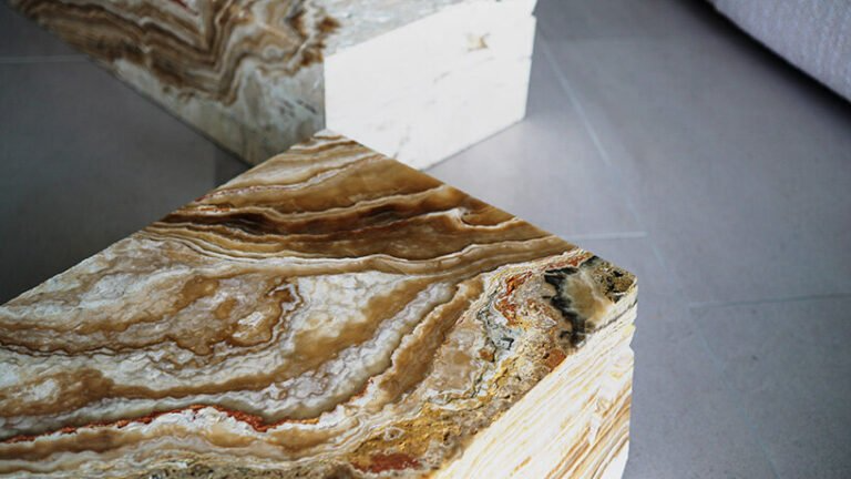 客厅地板采用了细腻的石材铺贴,浅色的布艺沙发搭配未经抛光修饰的大理石茶几,设计师希望通过这些富有质感的材料,来与通透、轻盈的房子进行虚与实的感官对比。