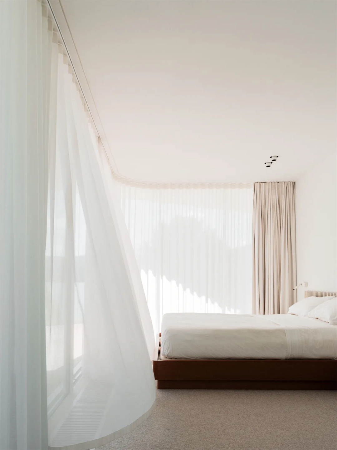 卧室利用白纱窗保证隐私缓解强烈光照,露台部分还运用了黄铜细柱(brise soleil)遮蔽。