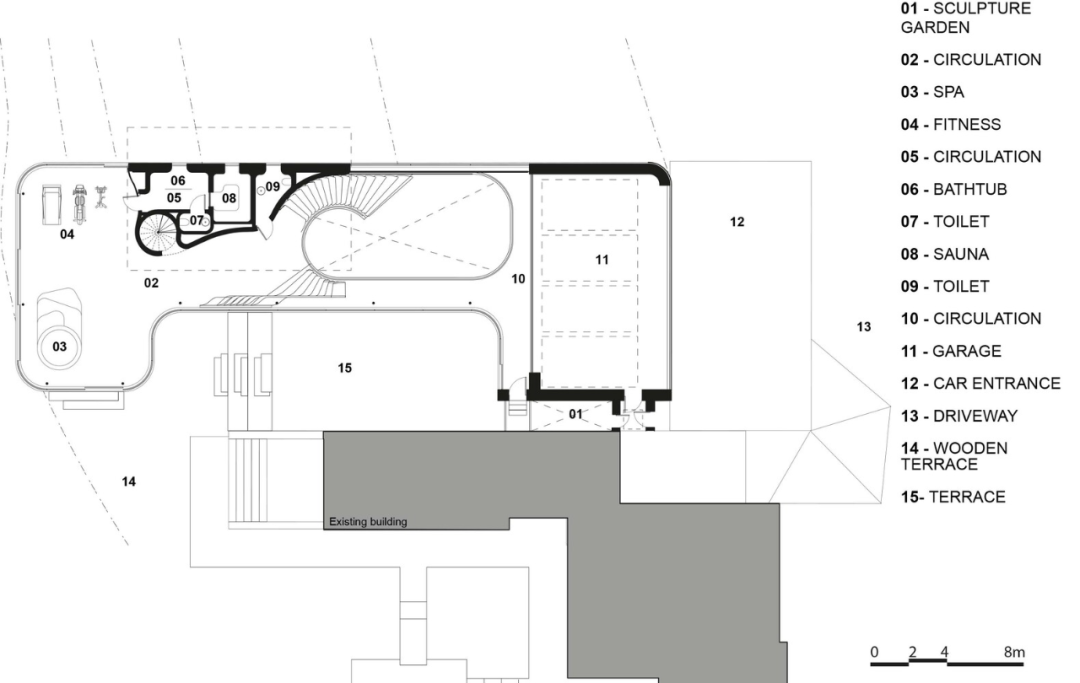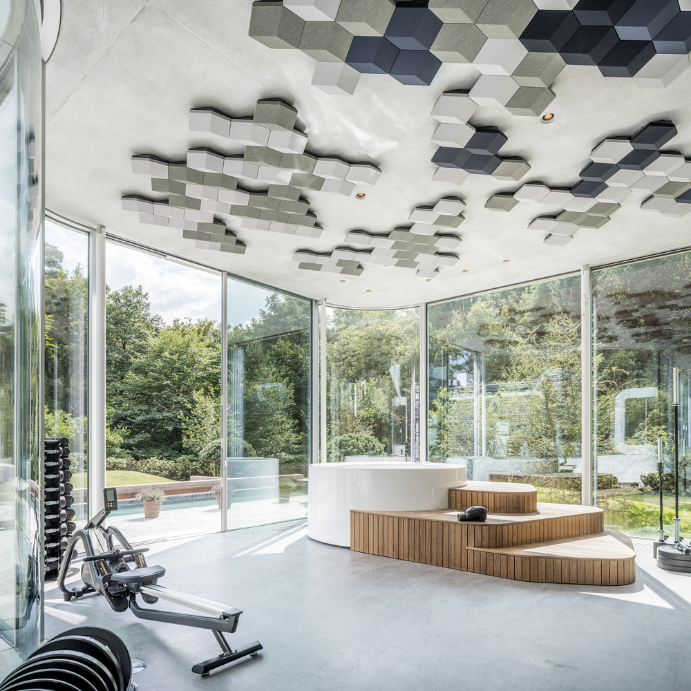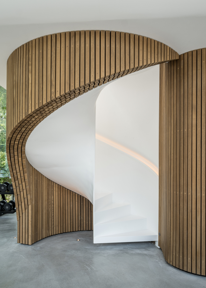 水疗中心藏在橡木墙后,通过白色旋转楼梯连接▽