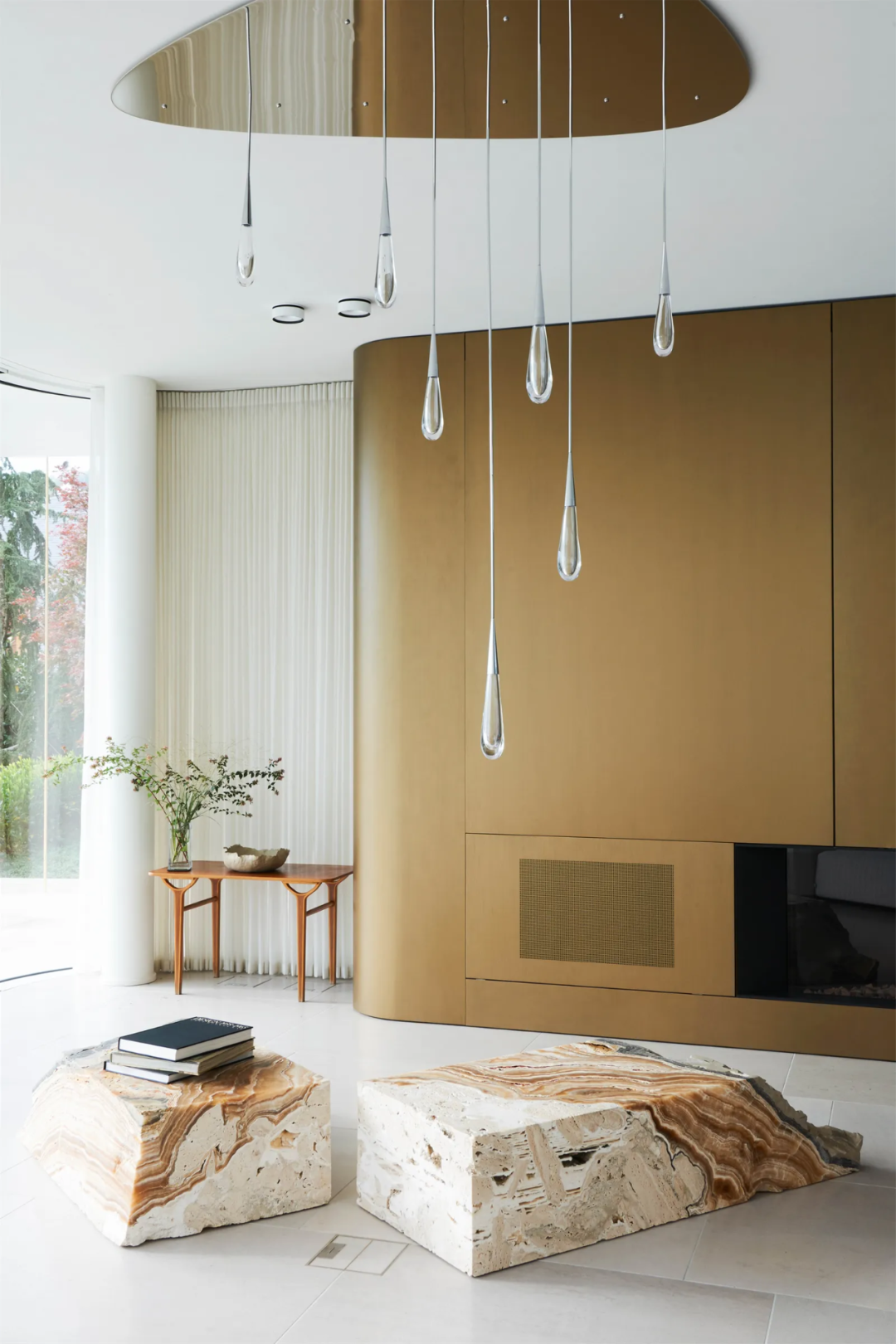 顶部镜面底的水滴形吊灯简洁璀璨,设计感十足▽