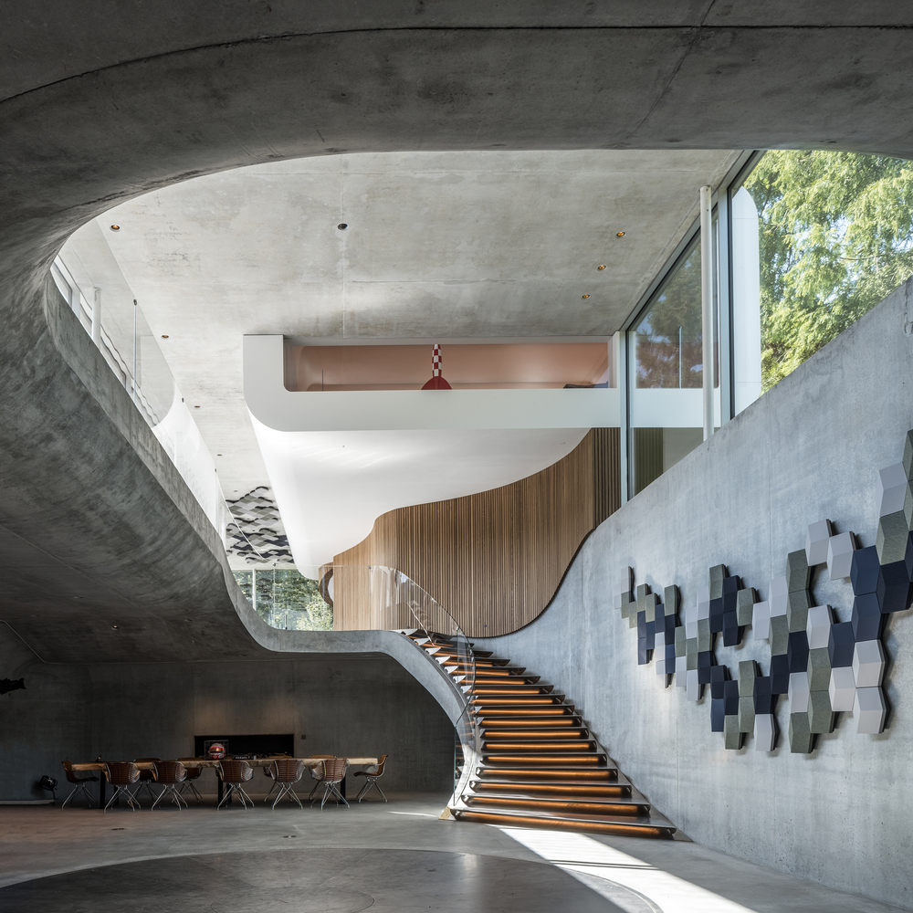 挑高空间同样做曲线,布局与房子的整体风格相呼应,还表达了更多变化和可能性。