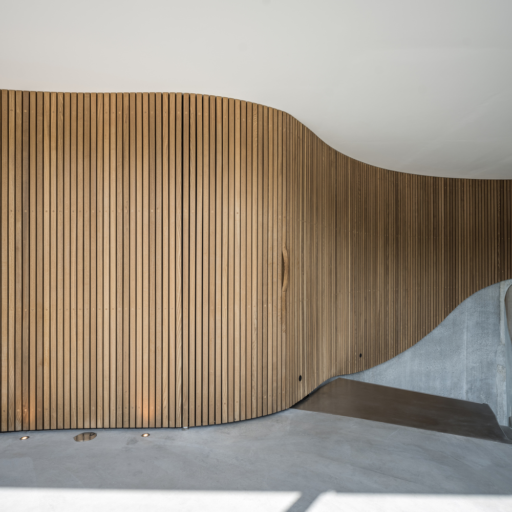 水泥自流平的地面碰撞竖条木格栅,起伏的墙面线条,于简约中蕴含丰富的层次美,也打破了常规墙面平铺直叙的规则。