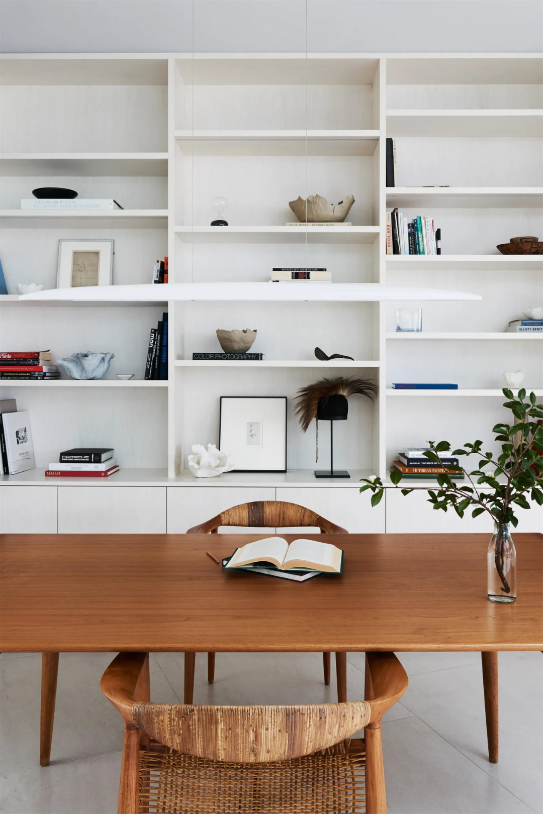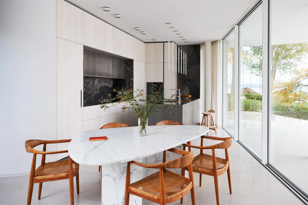 餐厅选用大理石异形餐桌,搭配 5 把木头藤椅,打造出设计师想要的质量和细节感。