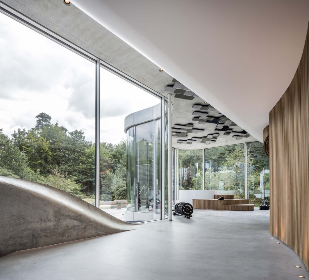 健身房将各种元素融合,混凝土的质朴与天然木材的温馨感,构筑了一个静谧安然的空间。