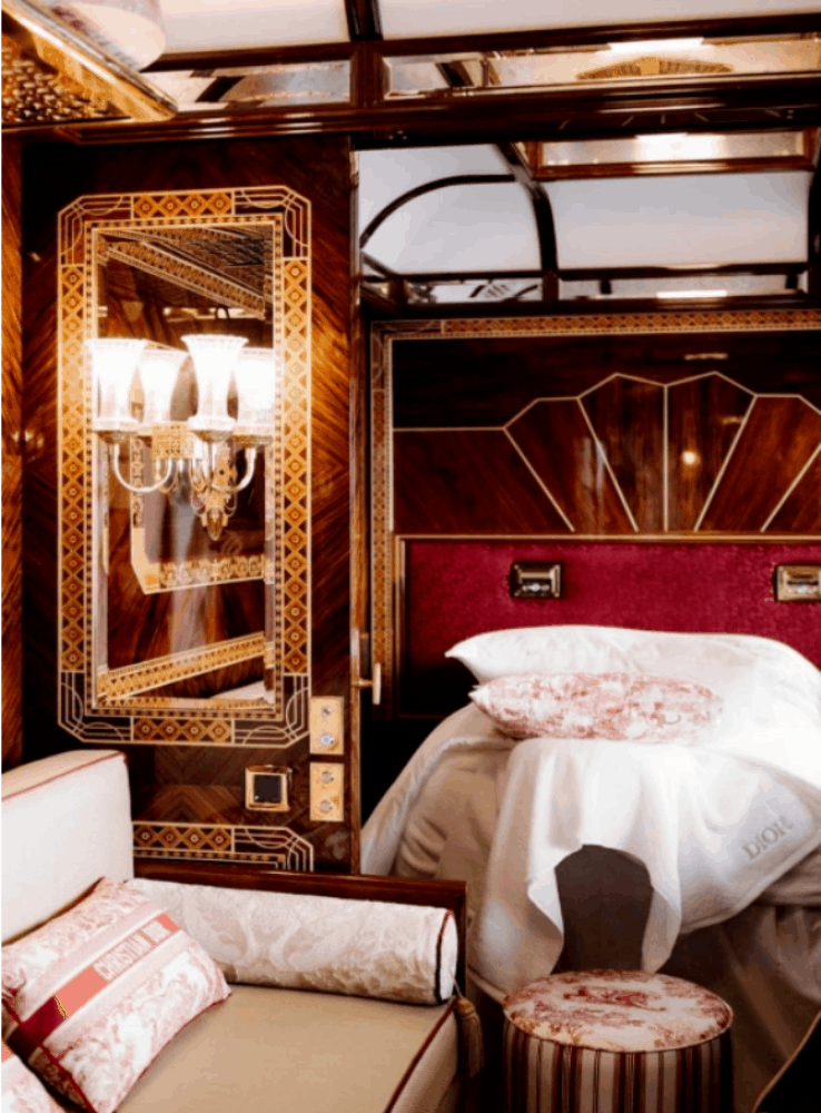 作为奢华列车旅行的代表,威尼斯·辛普伦东方快车被很多旅人心之向往。这次联动,更是直接把奢华酒店整个儿搬到了列车上:车厢的装饰延续了上世纪20年代的风格,摆满了Dior的家具系列,细节都蕴藏着浪漫与华美。