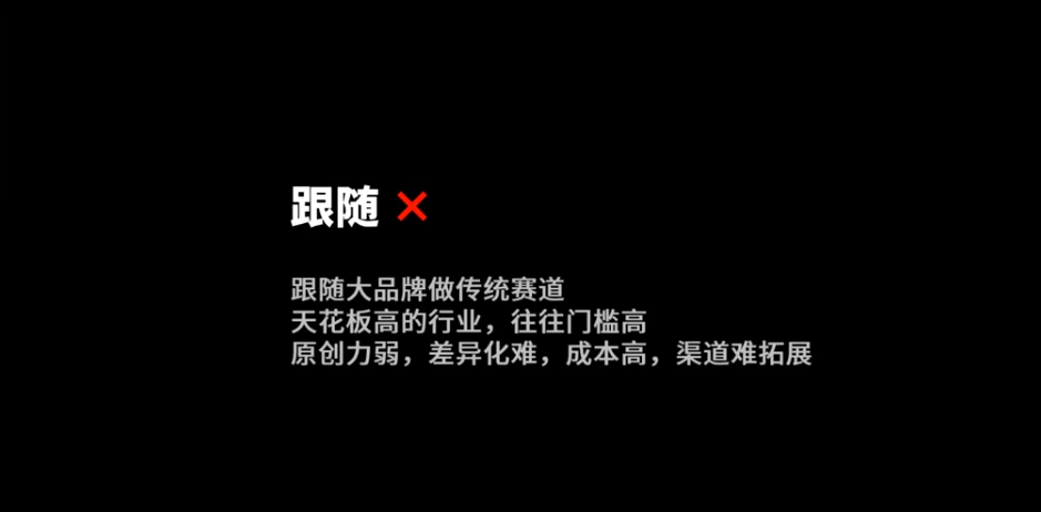 它有规模的效应,成本能跟供应链谈得非常低。很多人创业初期恰恰看不到这样的东西。所以如果你在初期跟随大品牌选择传统赛道,你要面临的不仅仅是产品创新的问题。