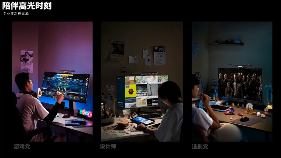 我们记得最早的屏幕挂灯是明基,还有小米的,然后是贝斯。但大家都是直的,而且基本上外观都是黑乎乎的,把它纯粹当工具挂在电脑上。匹配直面屏是蛮好的,但我们当时想切入一个更细分的市场,或者说一个价值感更高的市场。