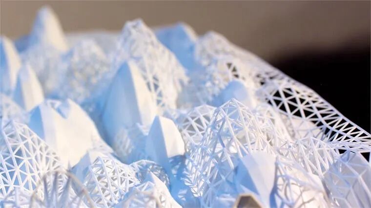 完成后的白色模型艺术品看起来像具有骨骼版本的山丘和山谷的风景。这些模型散步在Popian位于纽约皇后区的工作室,当他工作时,一台3D打印机会将这些组件组装在一起。