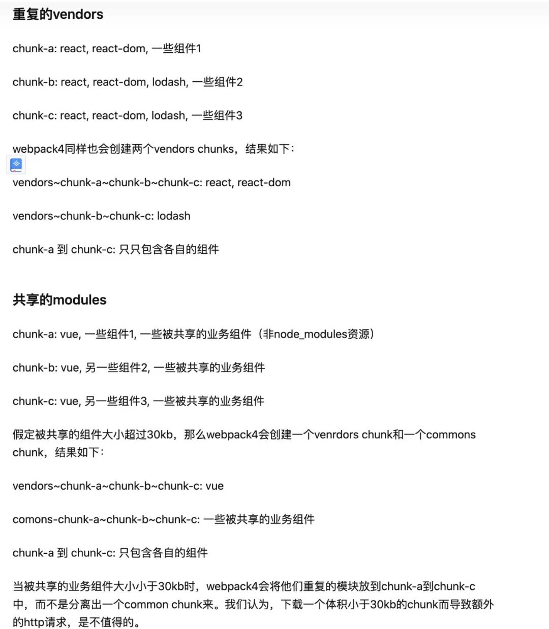 其中,可以发现SplitChunksPlugin产出的vendor-chunk有多个,对于入口A来说,引入的代码只有chunkA、vendor-chunkA-B、vendor-chunkA-C、vendor-chunkA-B-C;这时候chunkA、vendor-chunkA-B、vendor-chunkA-C、vendor-chunkA-B-C形成了一个chunkGroup。SplitChunksPlugin它会使用模块重复计数和模块种类(node_modules)自动识别哪些chunk需要被分离。可以类比一下两个插件。