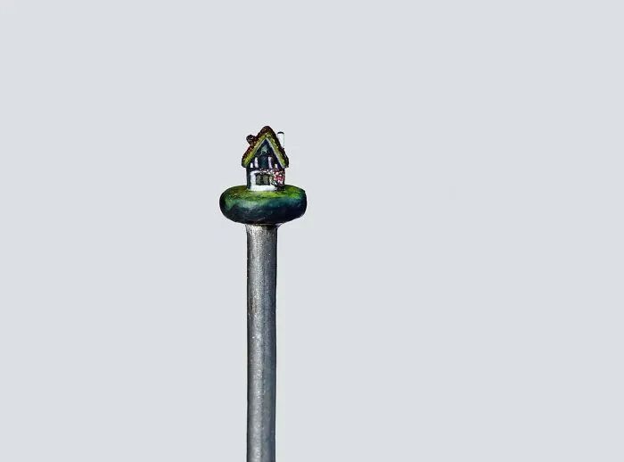 不过,付出的努力收获了相应的回报,玛丽·科希登的微雕技术越来越熟练,她雕刻的鸟儿惟妙惟肖栩栩如生,展翅欲飞的样子太真实了。除了鸟以外,她还在缝纫针上雕刻了一栋微型房子,可爱的样子萌到很多人。