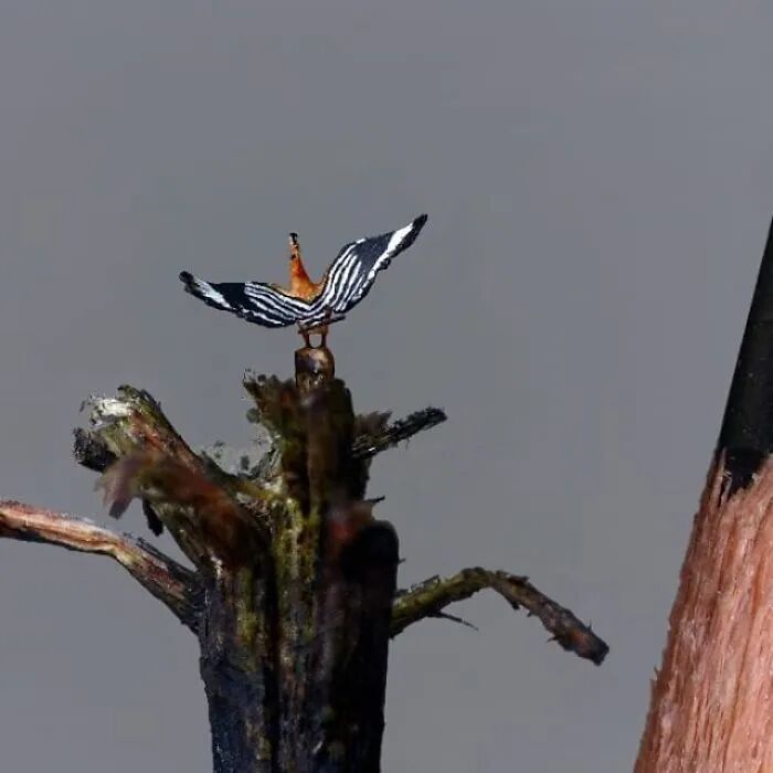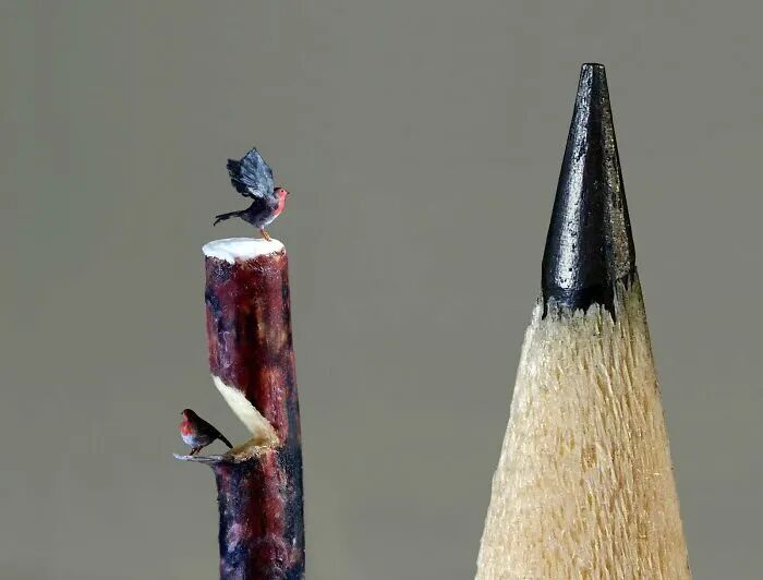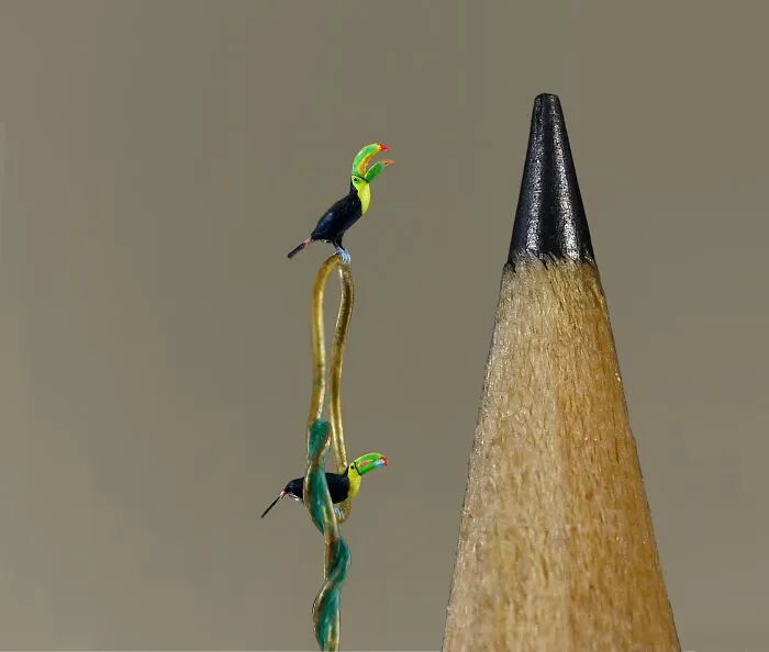 她最擅长的就是在笔芯上进行创作,最常创作的题材是各种各样的鸟,在几毫米的笔芯上进行雕刻,是一个不小的挑战,要雕出各种精致的细节,更是极度考验艺术家的技术和耐力,有时候一只鸟的眼睛或者喙部的细节,就需要耗费玛丽·科希登半个月的时间,而这一切都少不了特殊的放大镜的辅助。