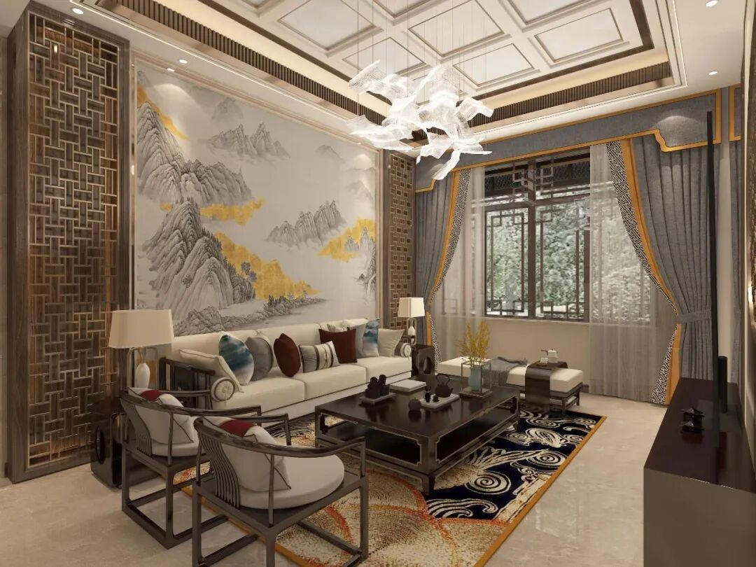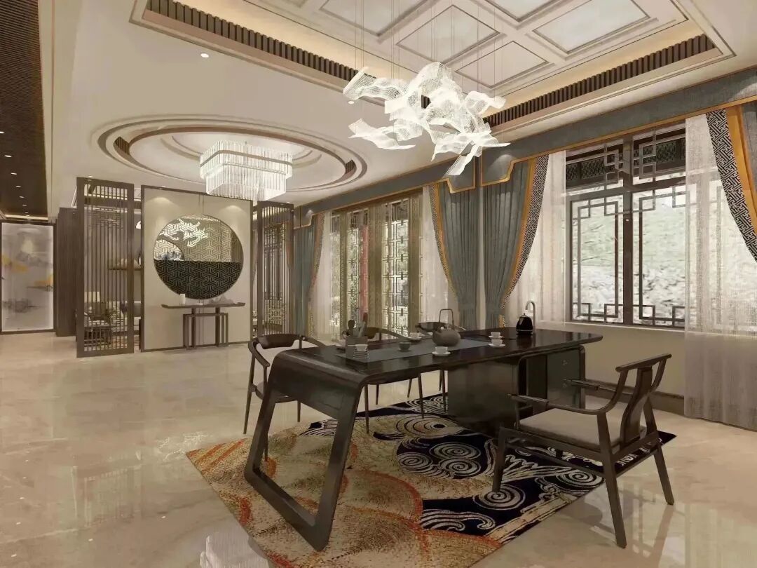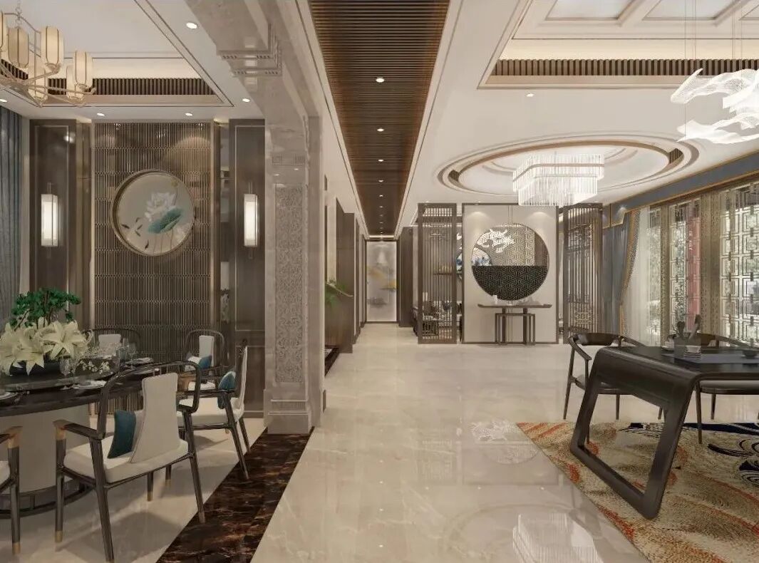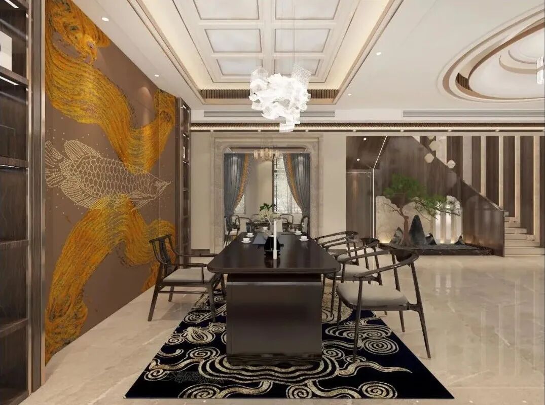 本案设计风格为摩登新中式,在多样化的新中式风格中,这套豪宅的设计手法运用了方圆结合,天圆地方,木材与金属的完美结合,以打造有温度,有质感,有品味,有归属感的家居空间 。方圆结合的入户大堂呼应了传统中式的形态,客厅与玄关之间的隔断,让空间增加层次感和装饰性,隔断在金色线条的点缀下,也更富有层次感。茶桌后方的金龙鱼,也代表年年有余的美好寓意。