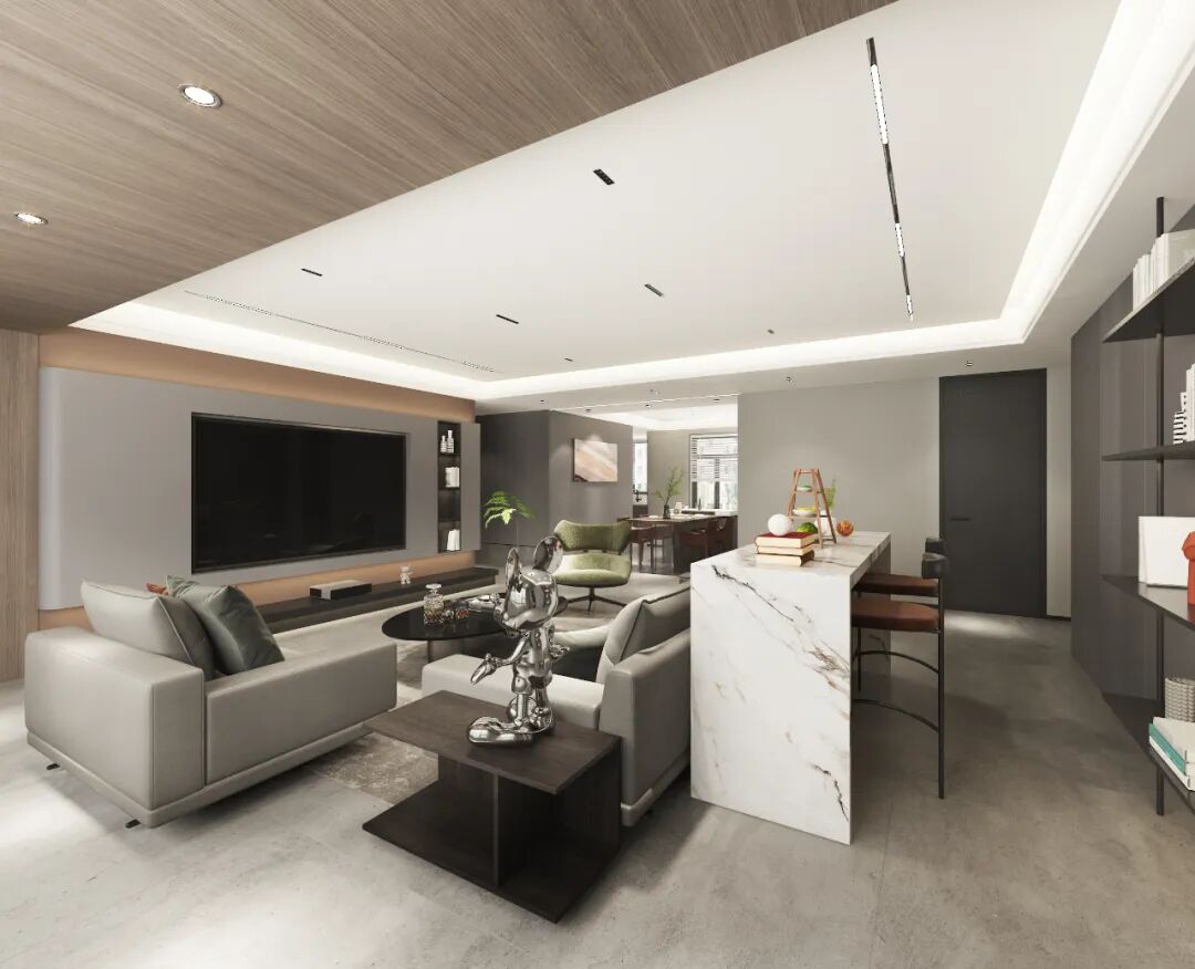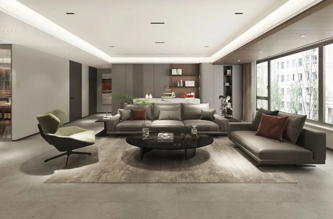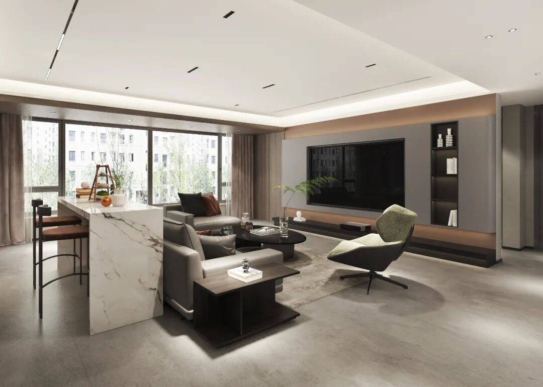 客厅采用900*1800大尺寸水泥砖,阳台打通与客厅融为一体,让阳光能充分照进客厅,沙发居中摆放,让空间看起来更为开阔,沙发墙到阳台之间具有墙体深度差,采用曲面造型过渡,弱化突兀感,影视墙采用收纳柜形式,搭配悬浮设计,减少视觉压迫感,圆角处理使造型更加轻盈柔美,在色彩搭配上采用了咖啡色来点缀,来中和灰色的冰冷感。餐厅厨房采用开放式设计,中岛与餐桌连通,让家人之间在做饭与吃饭时增加了更多的陪伴与参与感。通过改造S型墙体,把大尺寸冰箱移至餐厅,使厨房的操作空间更为宽敞。卧室空间延续整体设计,气质温润稳重,营造舒适静谧的睡眠空间。两个卫生间合二为一,做了大幅度调整,形成独立洗手区,马桶,淋浴三分离的布局,使布局更加合理。