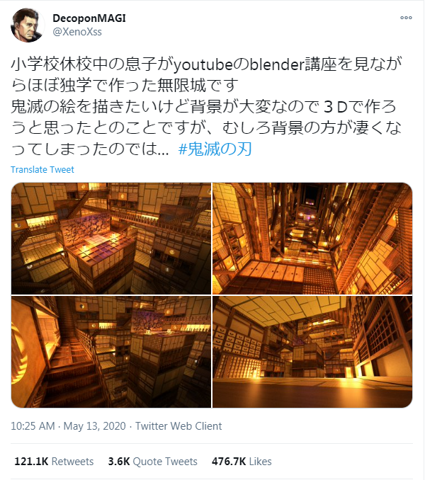 无独有偶,日本12岁的小男孩-悠人,在放假期间通过在网上学习建模软件Blender的教程,创作出《鬼灭之刃》中无限城的模型场景,并被他爸爸发布在了社交媒体上,获赞无数!