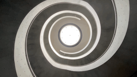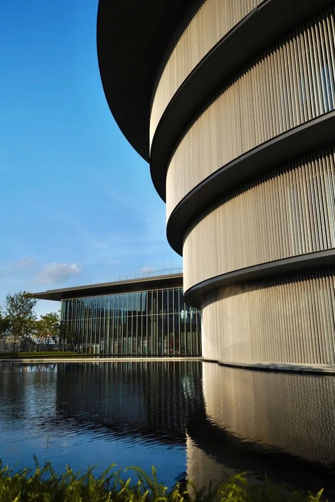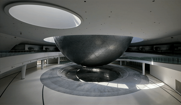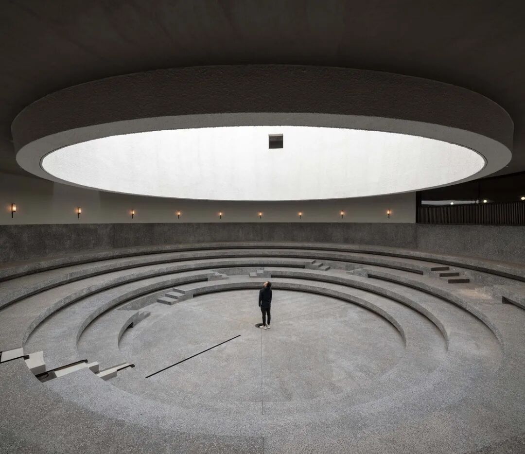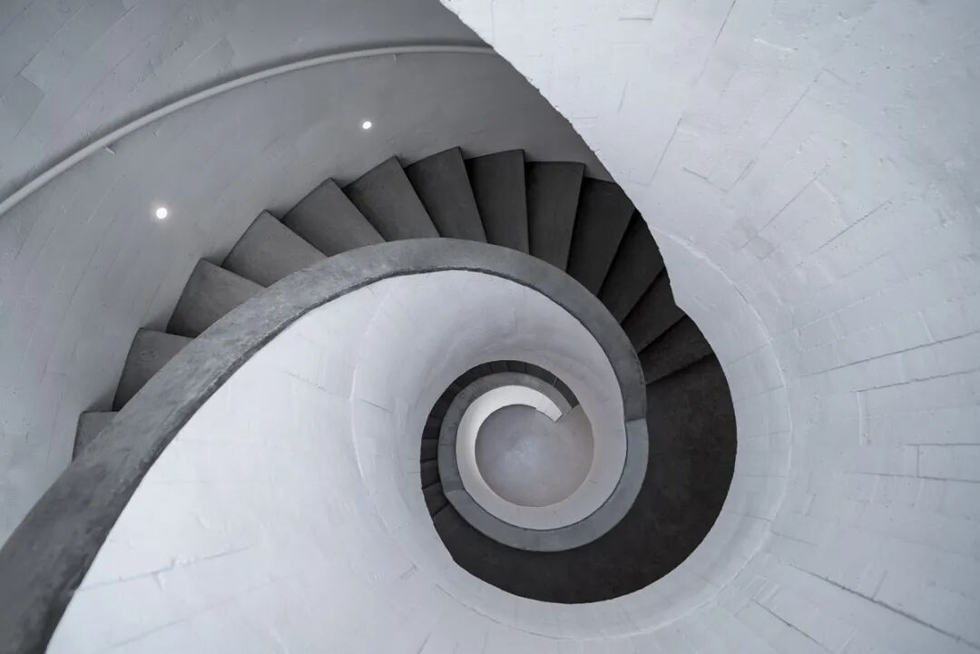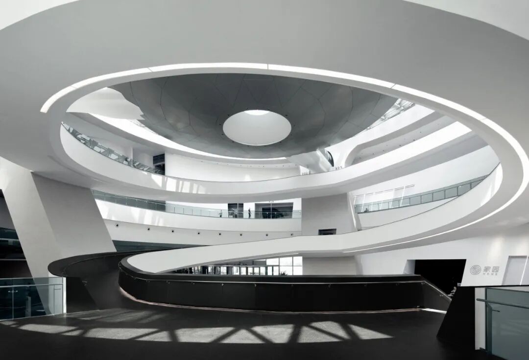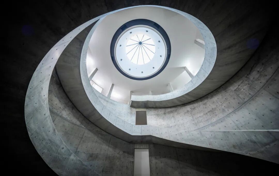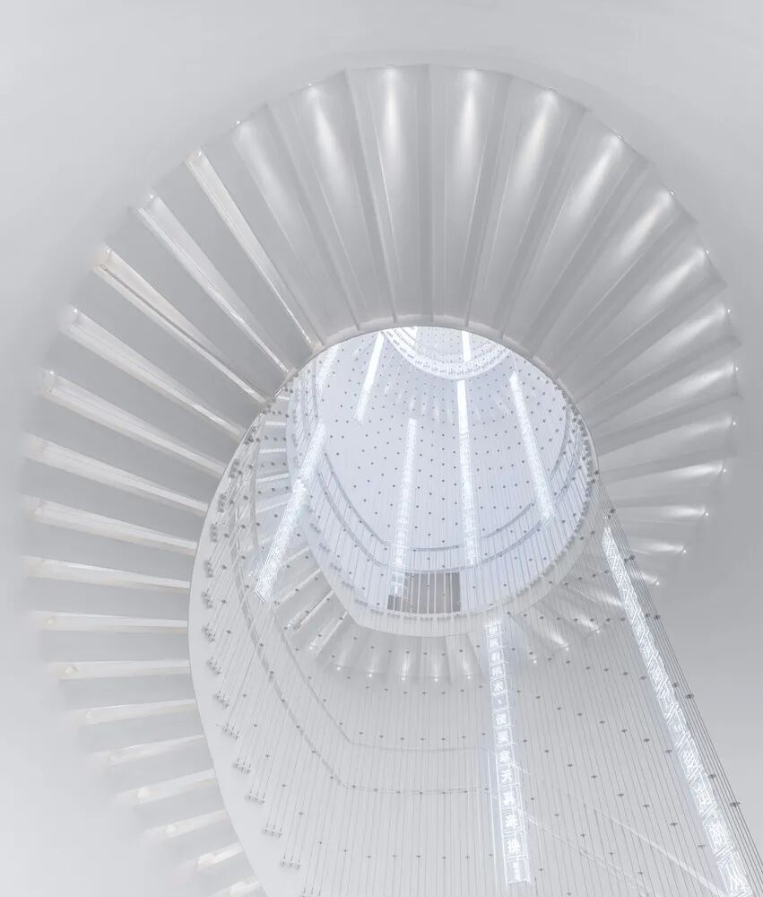 这是世界首条清水混凝土双螺旋楼梯。以双螺旋楼梯为中央,不同心圆形建筑如同水波纹一般层层向外,如向城市扩散的“涡旋”。