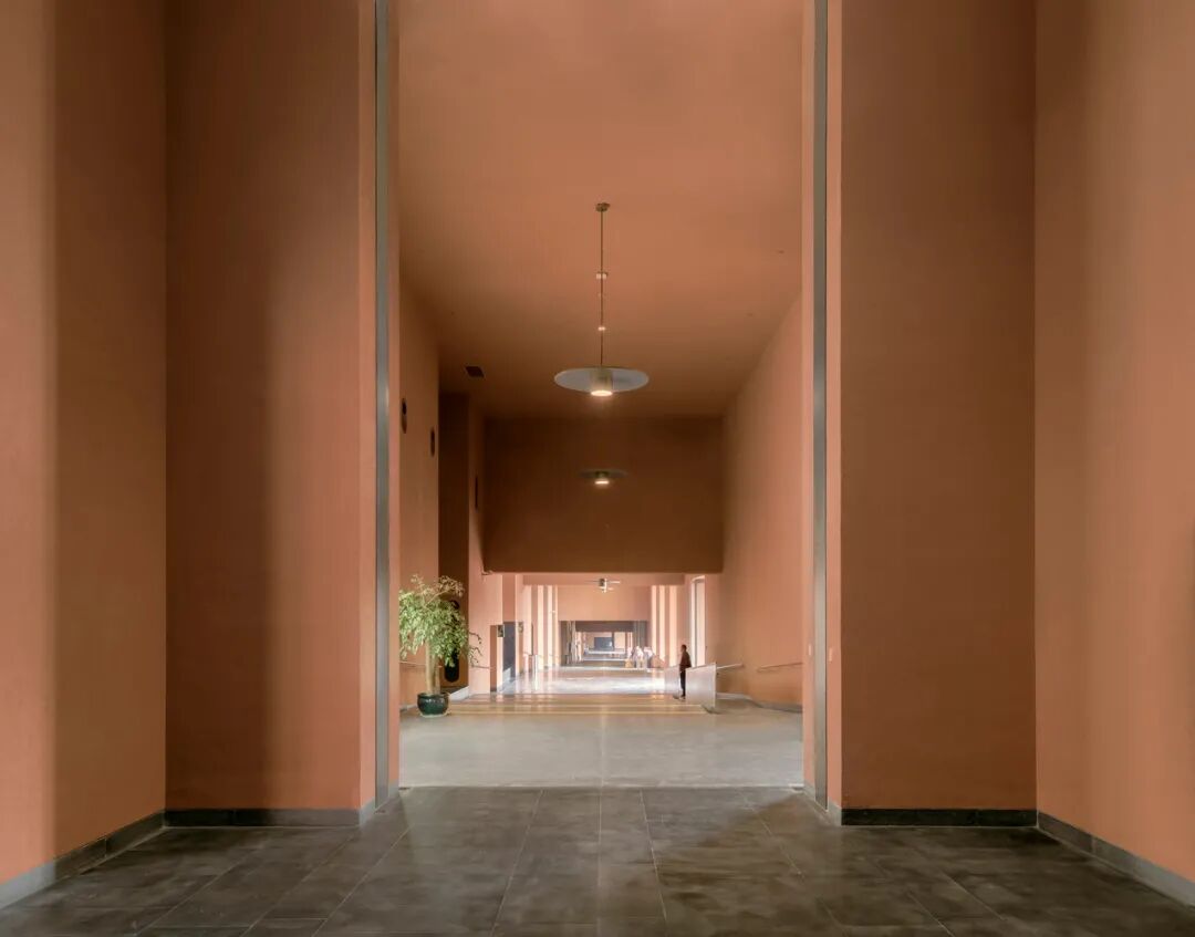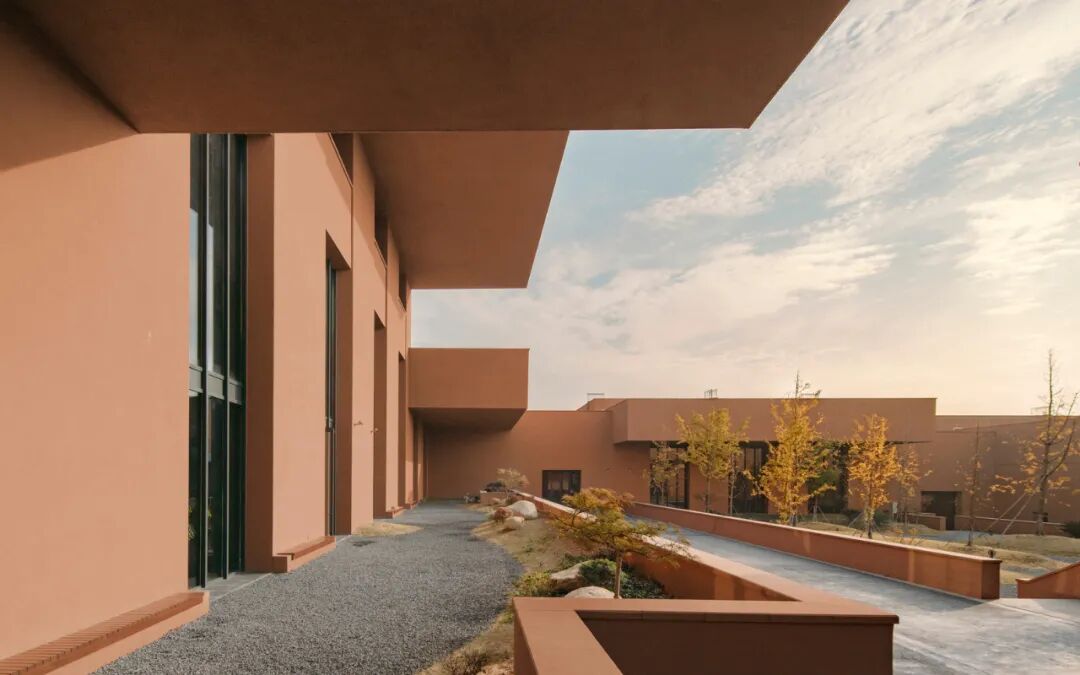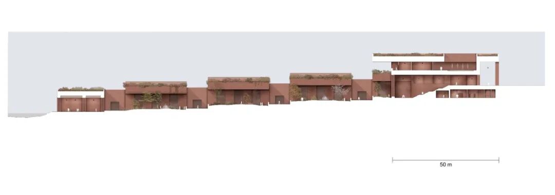 建筑立面的粉饰红赭色涂料,与场地山坡上的黏土颜色相近,进一步强化了建筑和景观之间的联系。
