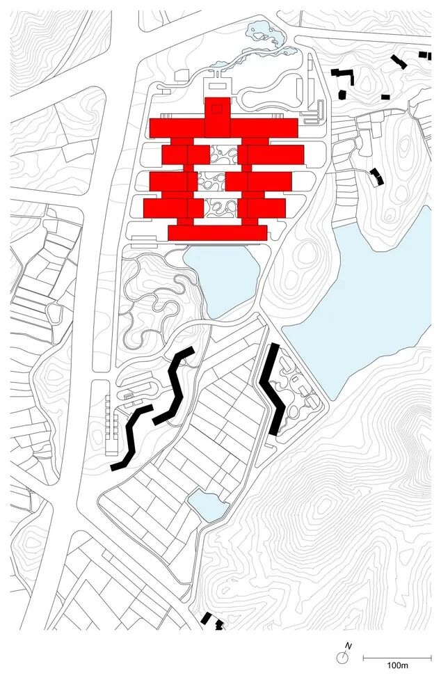 错落放置的8个单层长条形展厅沿坡地逐级布置。顺应自然地形,最小化建筑对景观的视觉冲击,并围合出一个开敞的内院。