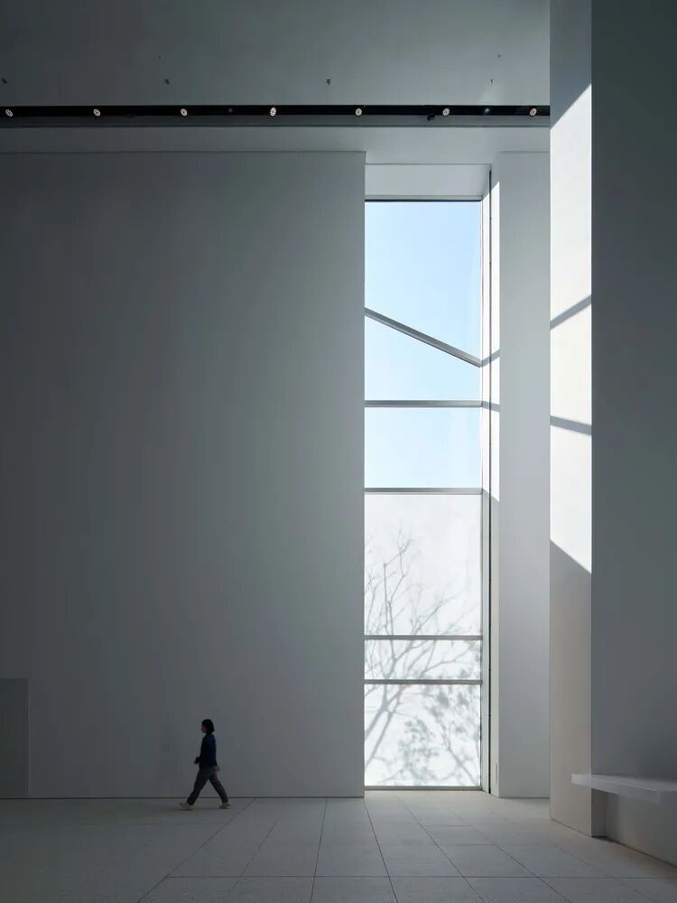 美术馆仿若一个漂浮在水面上的白色花岗岩盒子,越靠近江面,它的色彩就愈发有光泽。