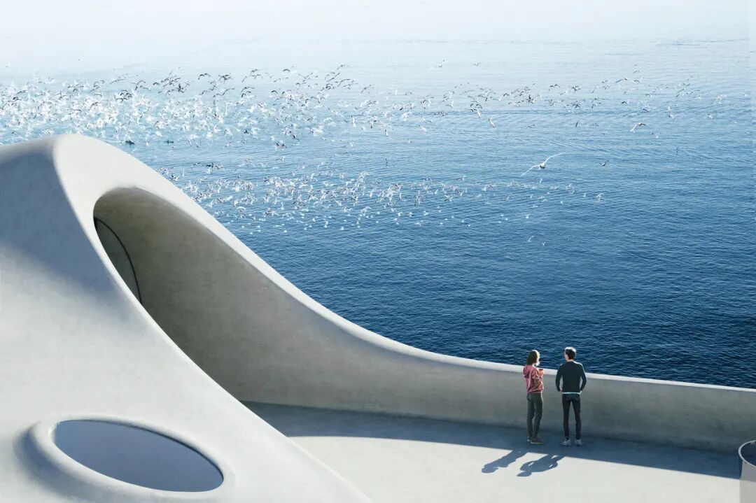 云洞图书馆位于海口世纪公园音乐广场西北侧,一体成型的白色建筑,仿佛一座多维的时空隧道,连接了城市与海岸、现实与想象。这里曾被英国《泰晤士报》评为“2021年最期待建成的建筑作品”。