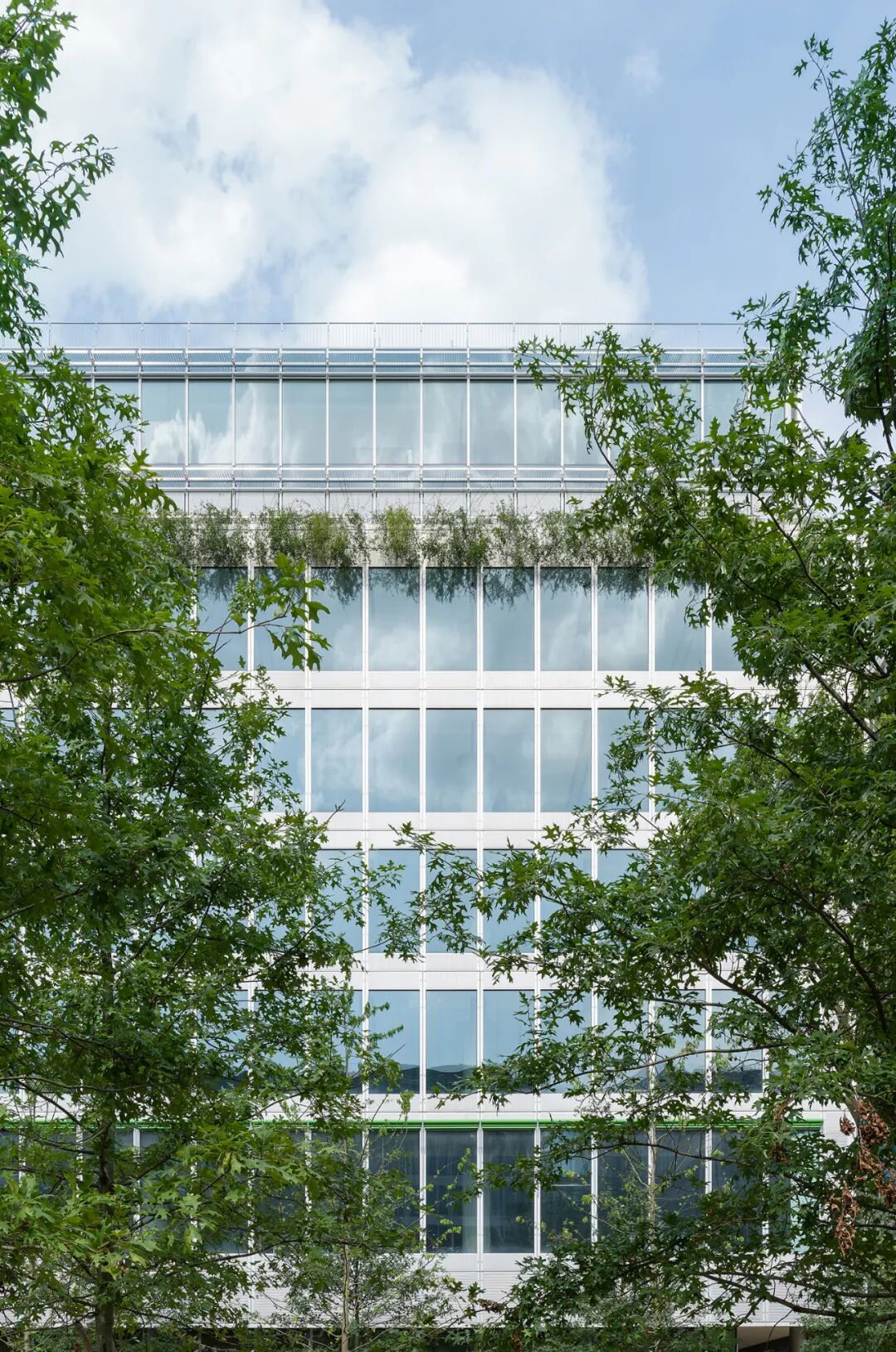 展厅坚实的建筑形式嵌入于中央庭院和周围公园的浓密景观中,植被一直延伸至绿化屋顶。