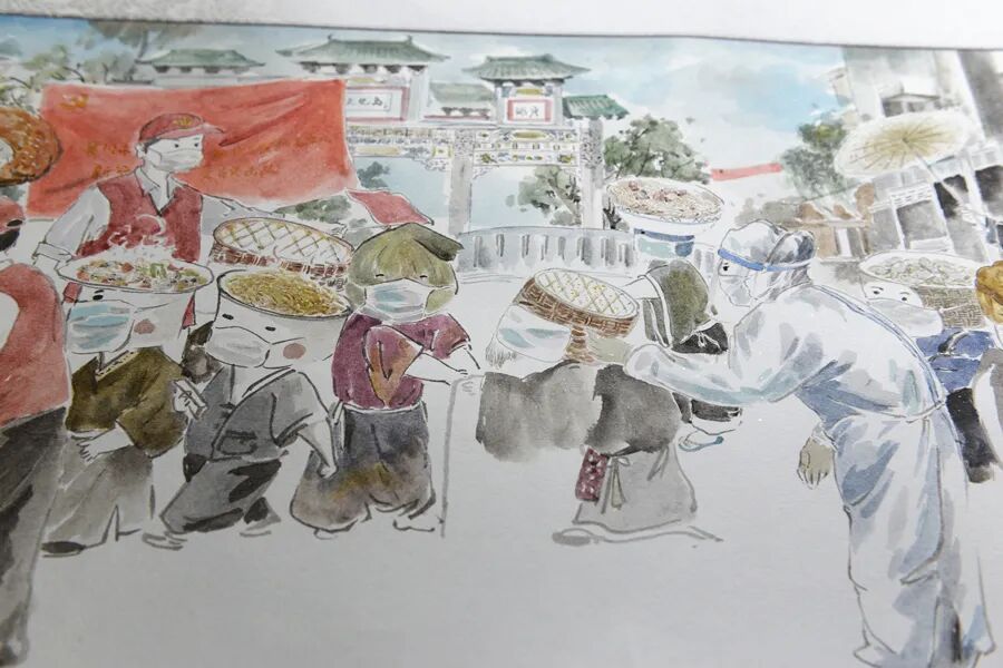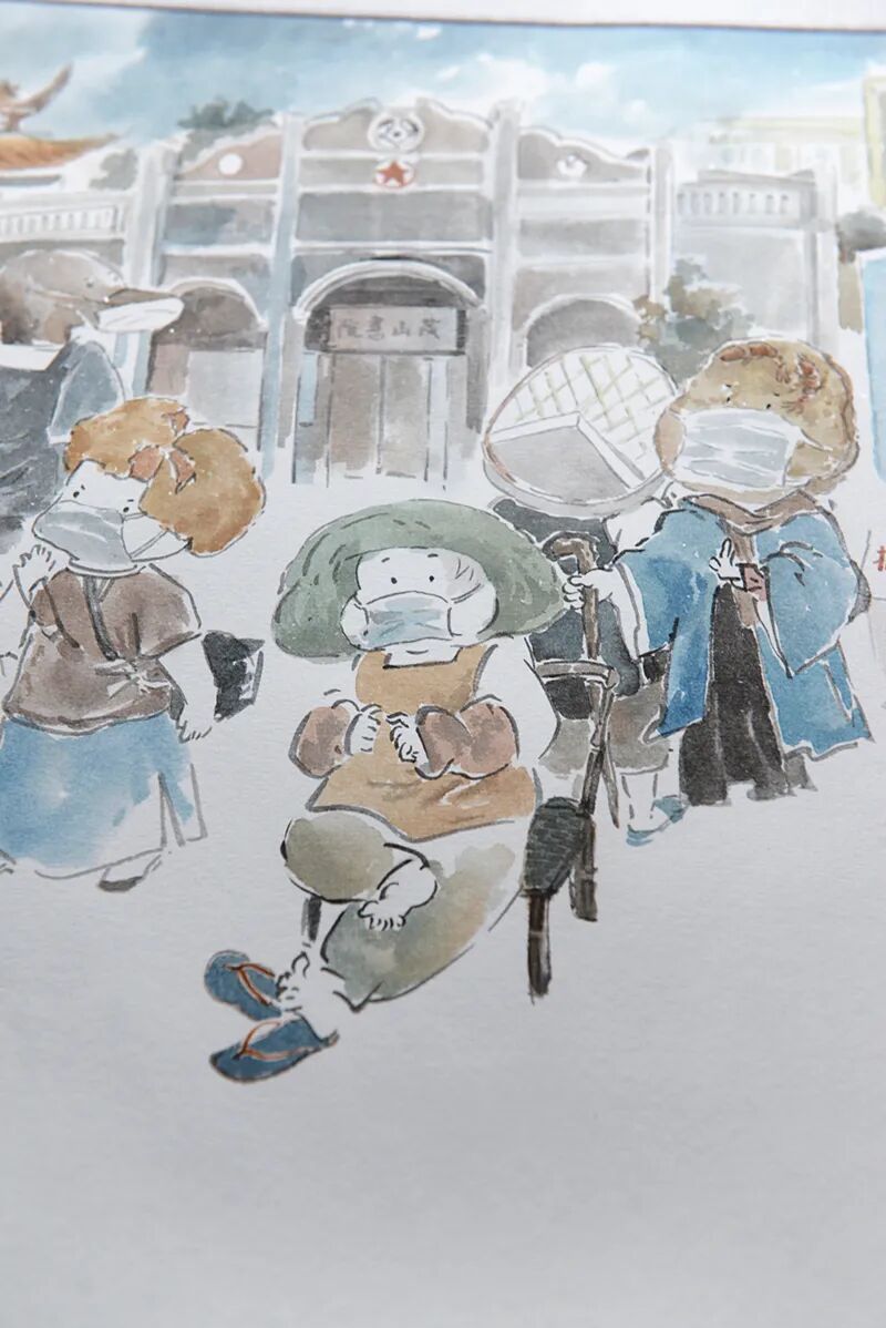 而今,“核酸检测上河图”整幅画卷,以大规模核酸检测为背景,全画共345个人物包含医护人员、居民、志愿者、消毒人员、新闻记者等,15个当地景点和标志性建筑物。