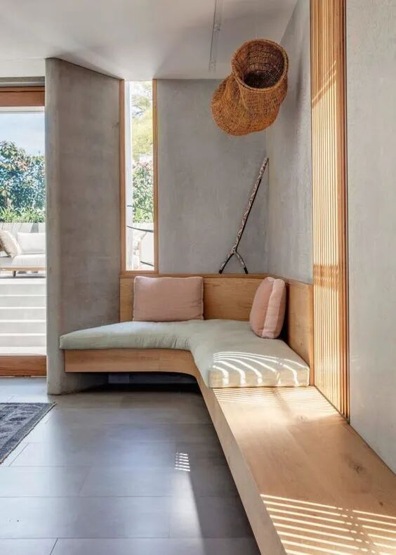 给墙面处装个木质悬空沙发。不仅占地面积小,花费也是最少的。家中任意一个大白墙空间都可以利用上,平时没有餐桌的时候可以作为一个休闲区使用,摆上桌子,就是餐厅或者书房,灵活性极强。