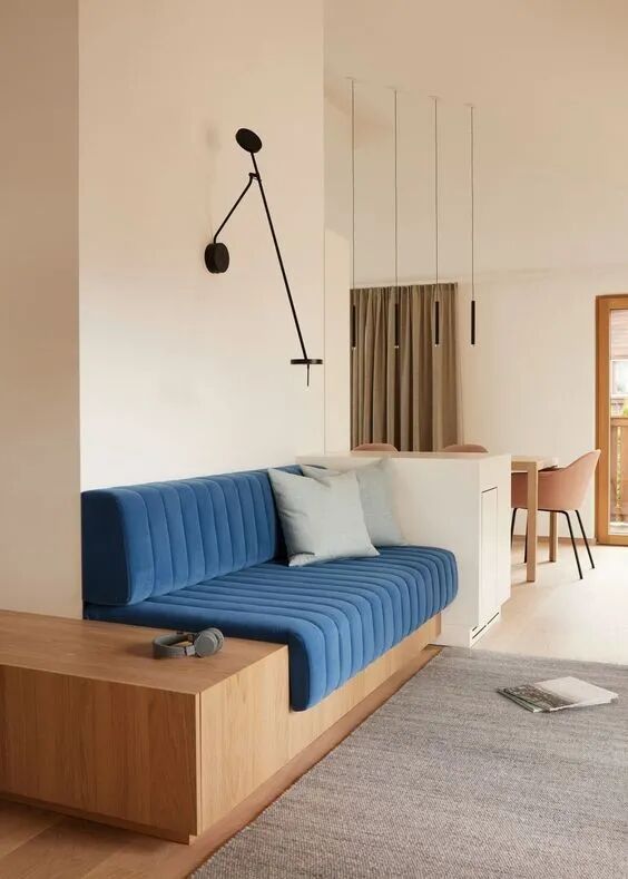 利用隔断墙做嵌入式沙发也是一种不错的省地大法。比如你家有一面墙体无法拆除,可以给底部添加木质台面,中间嵌入沙发,巧妙把空间利用起来的同时,又多个休憩场所,美观实用二合一。