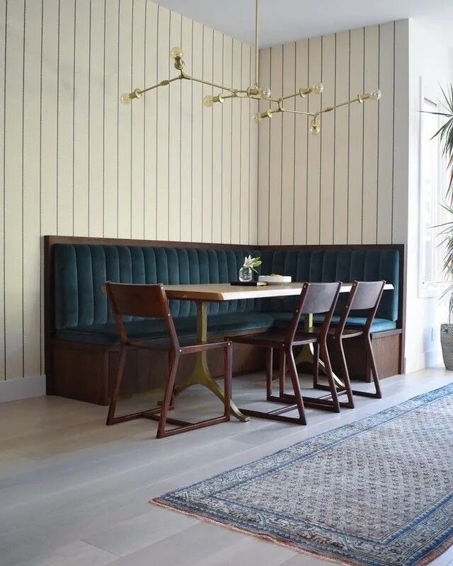 如果想给拐角处空间作为餐厅使用也可以,L型卡座+餐桌,在这里用餐吃饭,座位底部的空间还可以用来做物品的存储。