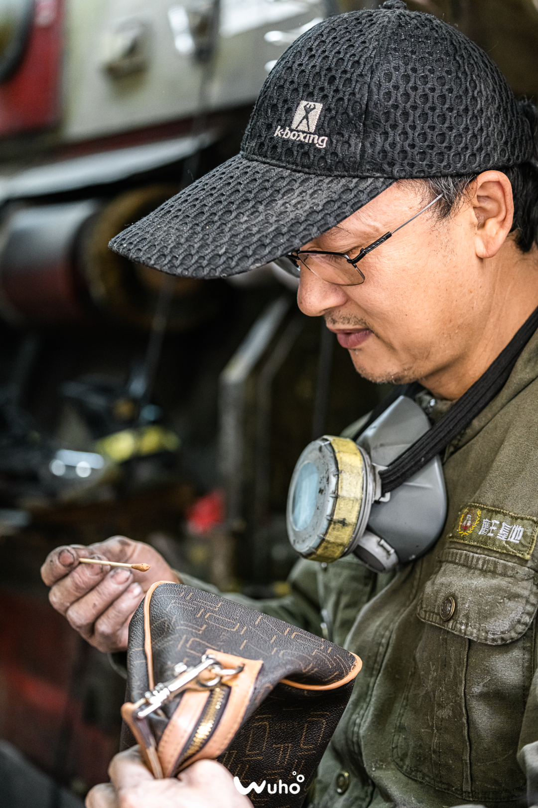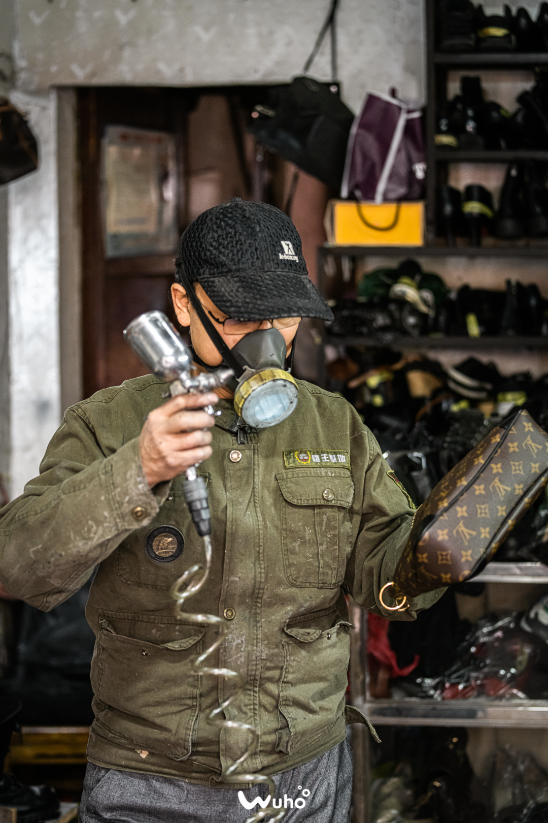 信任的客人把奢侈鞋包也送来修,我们去的时候一只LV包正挂在店里风干油漆。