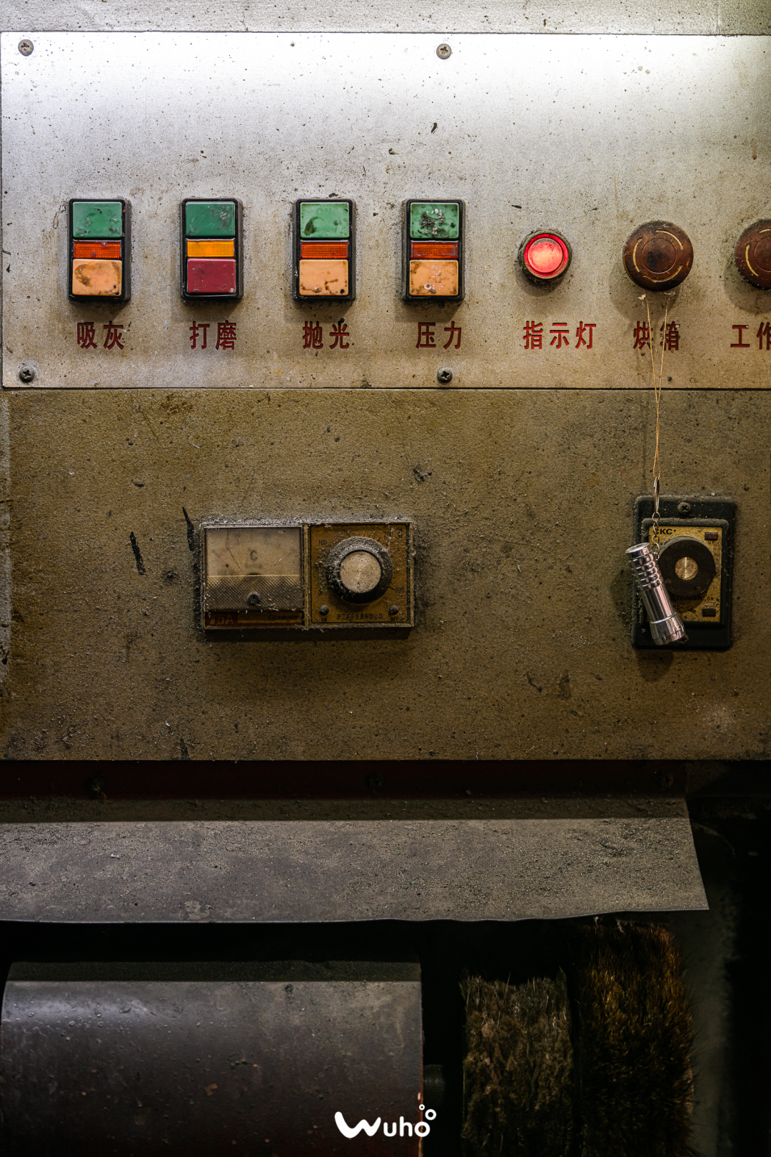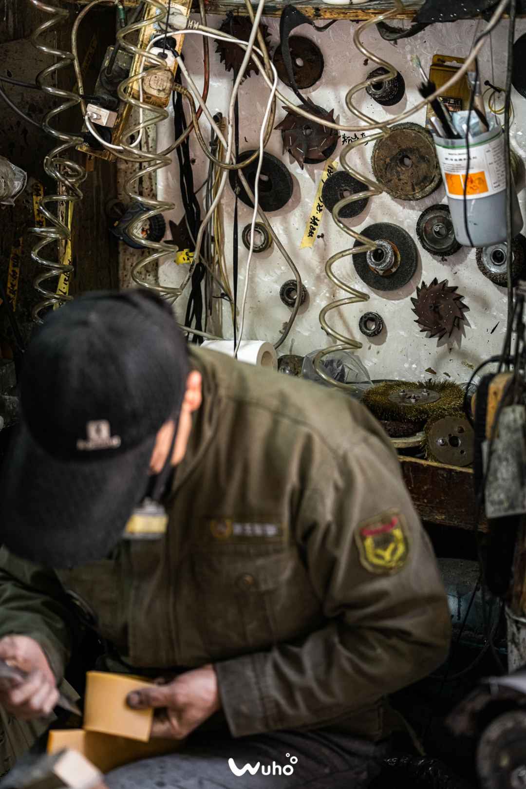 小店右侧是一台布满鞋尘的中型机床,不多见。主要用来打磨鞋底,开机时些微的轰鸣声给这家小店增加了几分车间气氛。