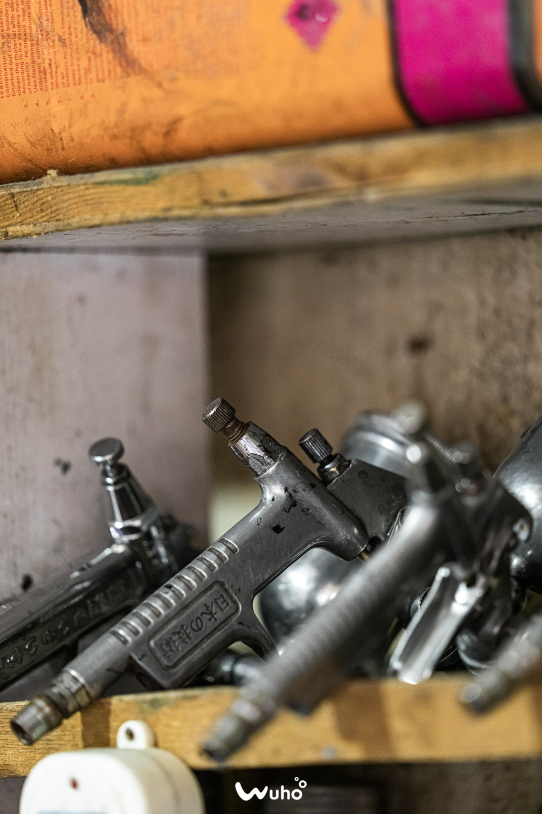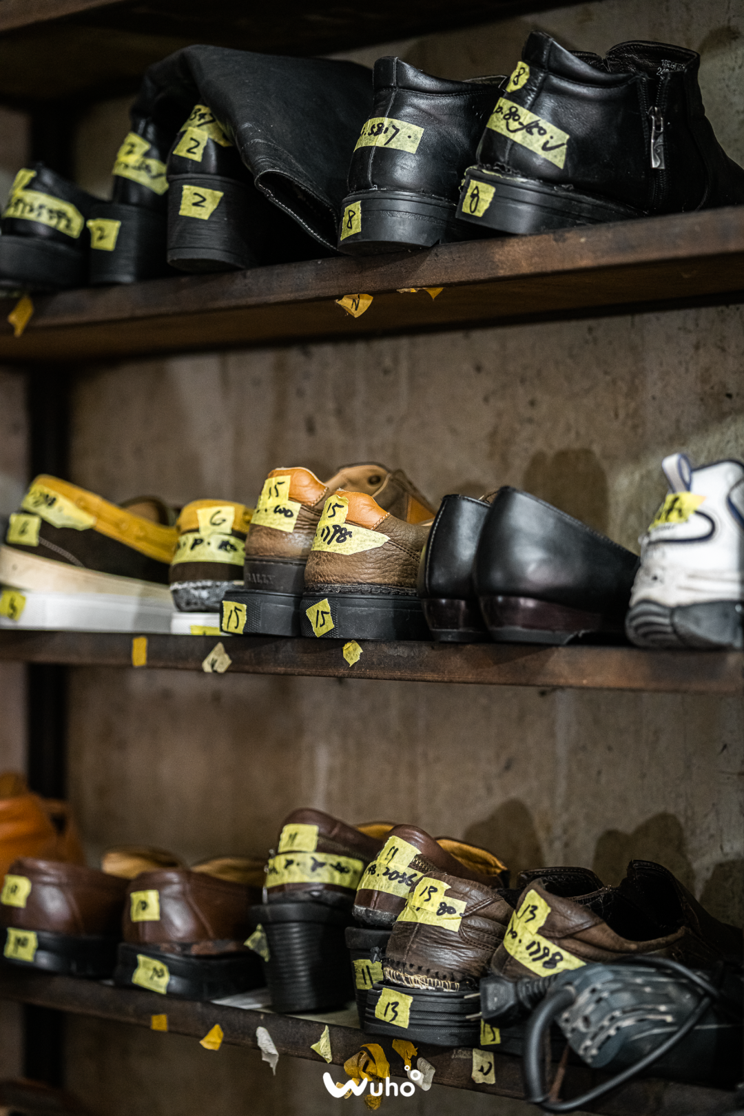 对于需要补漆的皮鞋,也有一排喷枪来精细化作业。不起眼的角落,一大一小两台烘箱给鞋们消毒、加热,方便分离脱胶的鞋与底。