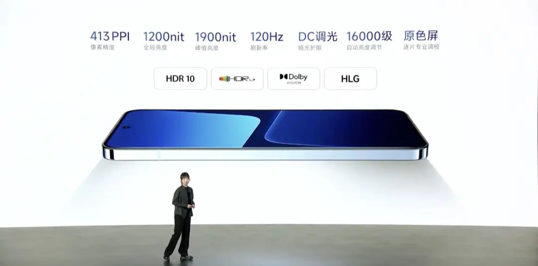小米 13 搭载 6.36 英寸定制超窄视觉四等边柔性直屏,配备 1.61mm 超窄边,93.3% 超大屏占比,采用 E6 发光材质,峰值亮度 1900nit,功耗降低 22%,支持全局 120Hz 高刷,应用还能逐一单独设置,还支持 DC 调光。