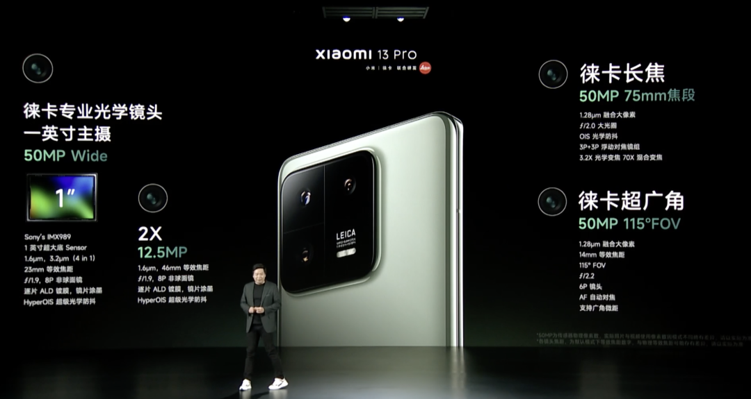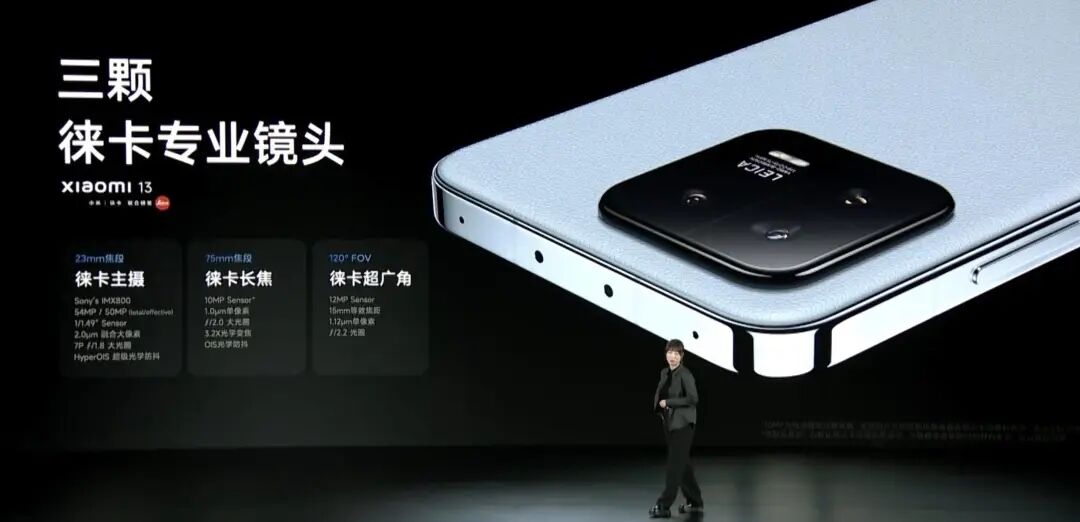 小米 13 搭载了全部原生徕卡的影像能力:5000 万像素、IMX 800 徕卡主摄(23mm);1200 万像素超广角(15mm)以及 1000 万像素长焦(75mm)。专业徕卡专业光学镜头,覆盖 15mm、23mm、46mm 以及 75mm 焦段,支持 HyperOIS 超级光学防抖。