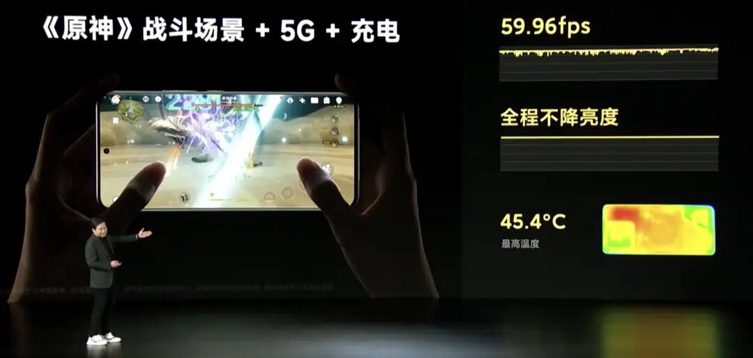 性能方面,小米 13 Pro 拥有小米 13 同款的第二代骁龙 8 及周边配置,雷总特别展示了《原神》Boss 战+5G+充电场景的表现,几乎能维持满帧,看起来确实不错。