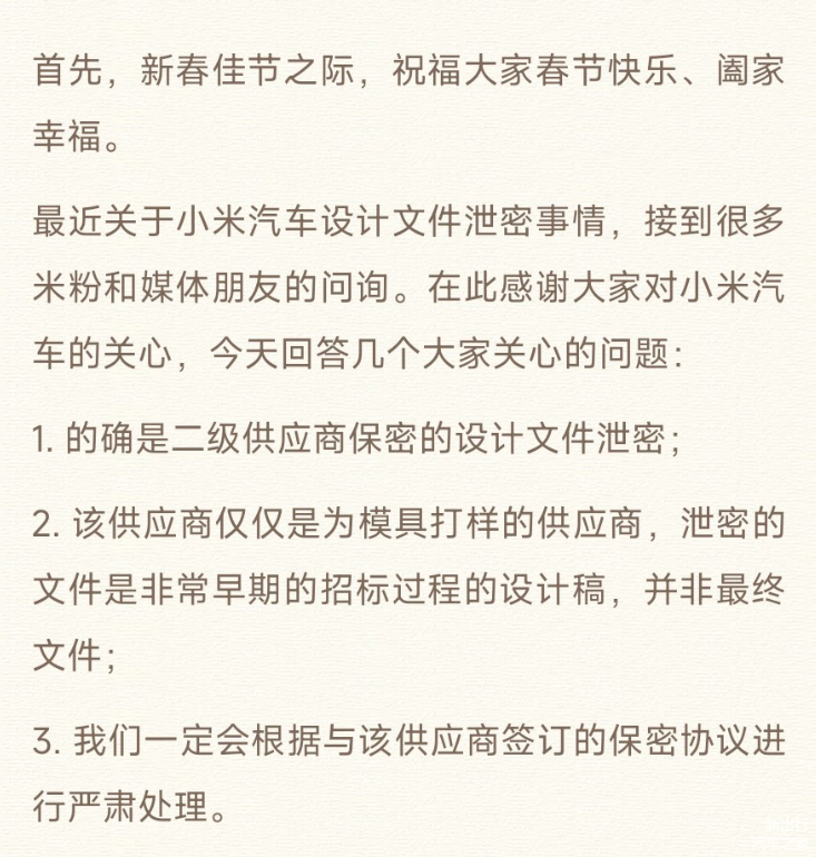 此外小米汽车发布声明,此次设计文件泄密的确是二级供应商保密的设计文件泄密;该供应商仅仅是为模具打样的供应商,泄密的文件是非常早期的招标过程的设计稿,并非最终文件;小米汽车最终会根据与该供应商签订的保密协议进行严肃处理。