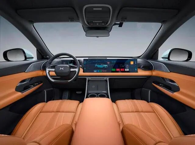 8月10日上午小鹏G9正式发布的内饰官图!小鹏G9采用环抱式座舱设计,经典的暖棕色系与大面积的高品质皮革覆盖。中控屏幕十分醒目,几乎没什么实体按键,采用了中控+副驾娱乐屏的设计。座椅方面,采用了棕色皮质设计。