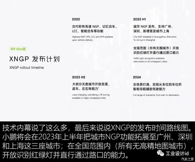 2023年下半年,小鹏将在大部分无高精地图城市开放变道、超车以及左/右转能力。小鹏预计会在2024年内达成全场景导航辅助驾驶,实现从车位到车位的导航驾驶辅助。目前,小鹏旗下只有G9 Max版是采用英伟达Orin平台智能驾驶域控制器,所以G9 Max版的车主会是首批体验XNGP功能的人。
