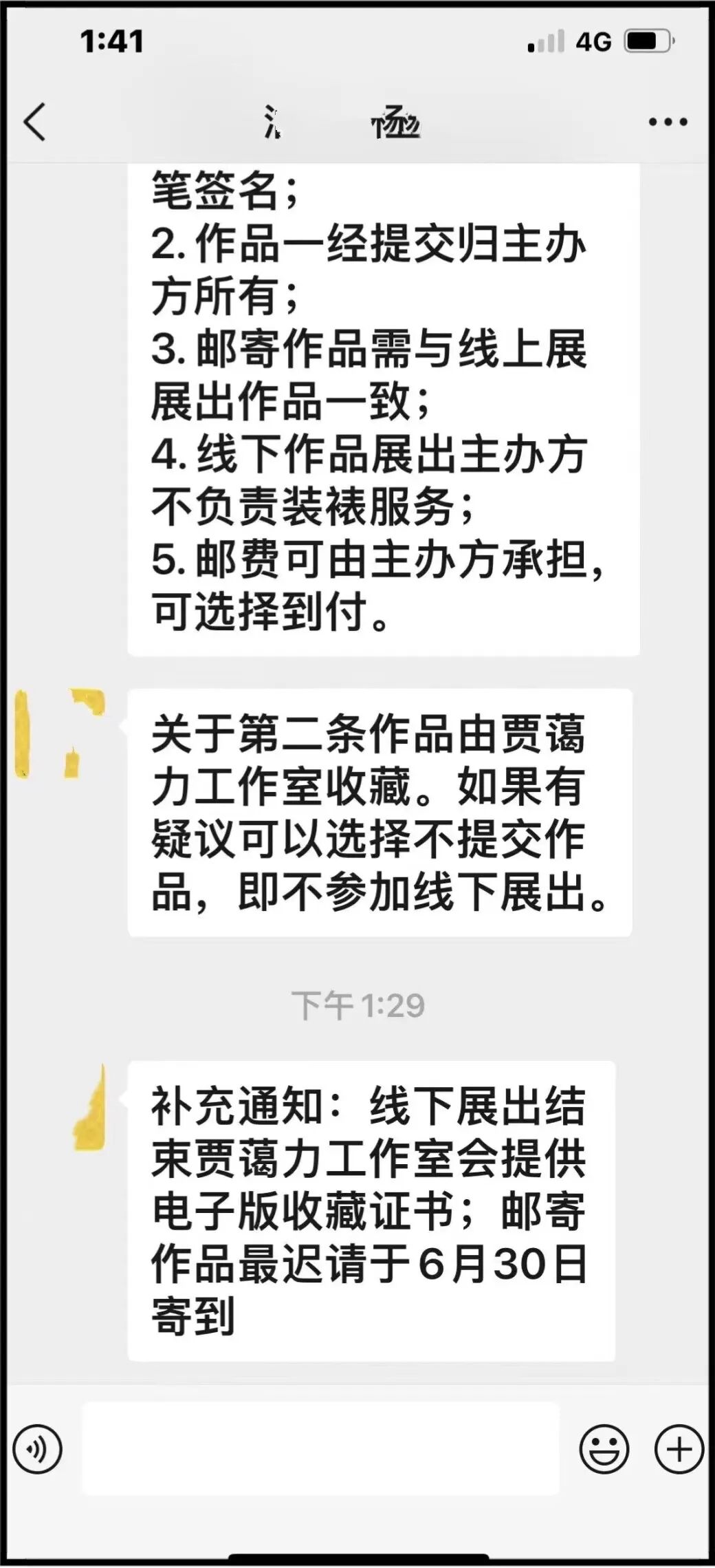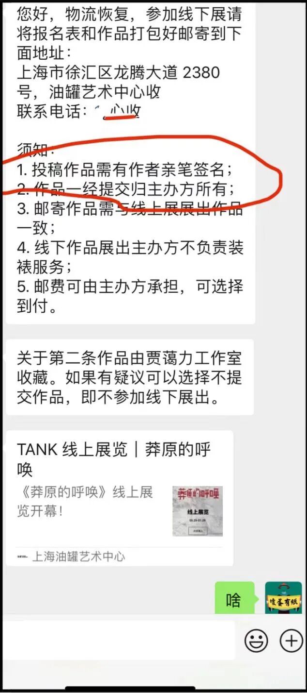 随后我又问了一些从业者,至此基本确认了事实。还好人家也说得很明白,不提交作品即不参加线下展出,显示出明确且坚决的态度。